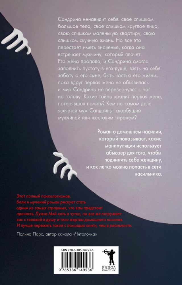 💳 Оплатить за товар можно при получении 🇰🇿 Есть бесплатная доставка по Казахстану от 1 дня 🎁 Копите бонусы с каждой покупки Сандрина ненавидит себя: свое слишком большое тело, свое слишком круглое лицо, свою слишком маленькую квартиру, свою слишком скучную жизнь. Но все это перестает иметь значение, когда она встречает мужчину, который плачет. Его жена пропала, и Сандрина смогла заполнить пустоту в его душе, взять на себя заботу о его сыне, быть частью его жизни... пока вдруг первая жена не объявилась, и мир Сандрины не перевернулся с ног на голову. Какие тайны хранит первая жена, потерявшая память? Кем на самом деле является муж Сандрины: скорбящим мужчиной или жестоким тираном? |