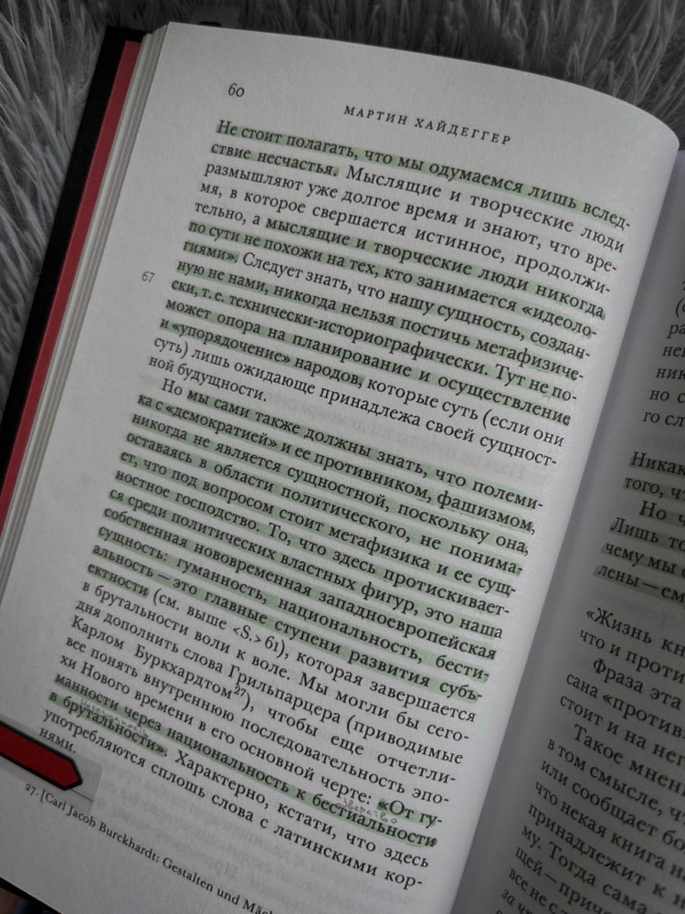 Увидел это издание, обуял трепет. Неврастенией - "он же пособник нацистов" - не обладаю. Чувствуется величина фигуры для философии и истории в целом. В общем, сразу заказал. Содержание не особо поддаётся рецензированию. Аннотация на обложке исчерпывающе отражает что же от книги ожидать. Текст крайне сложный, лёгкой прогулки ждать не стоит, желателен читательский (философский) опыт…дискутировать есть над чем. Под суперобложкой монотонный чёрный переплёт. Красота. Хочется верить, что на Flip появятся “чёрные тетради” иных периодов.