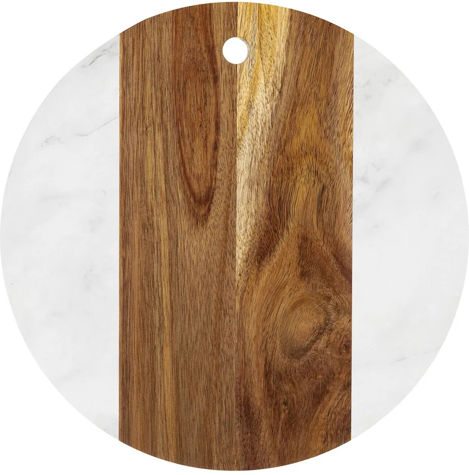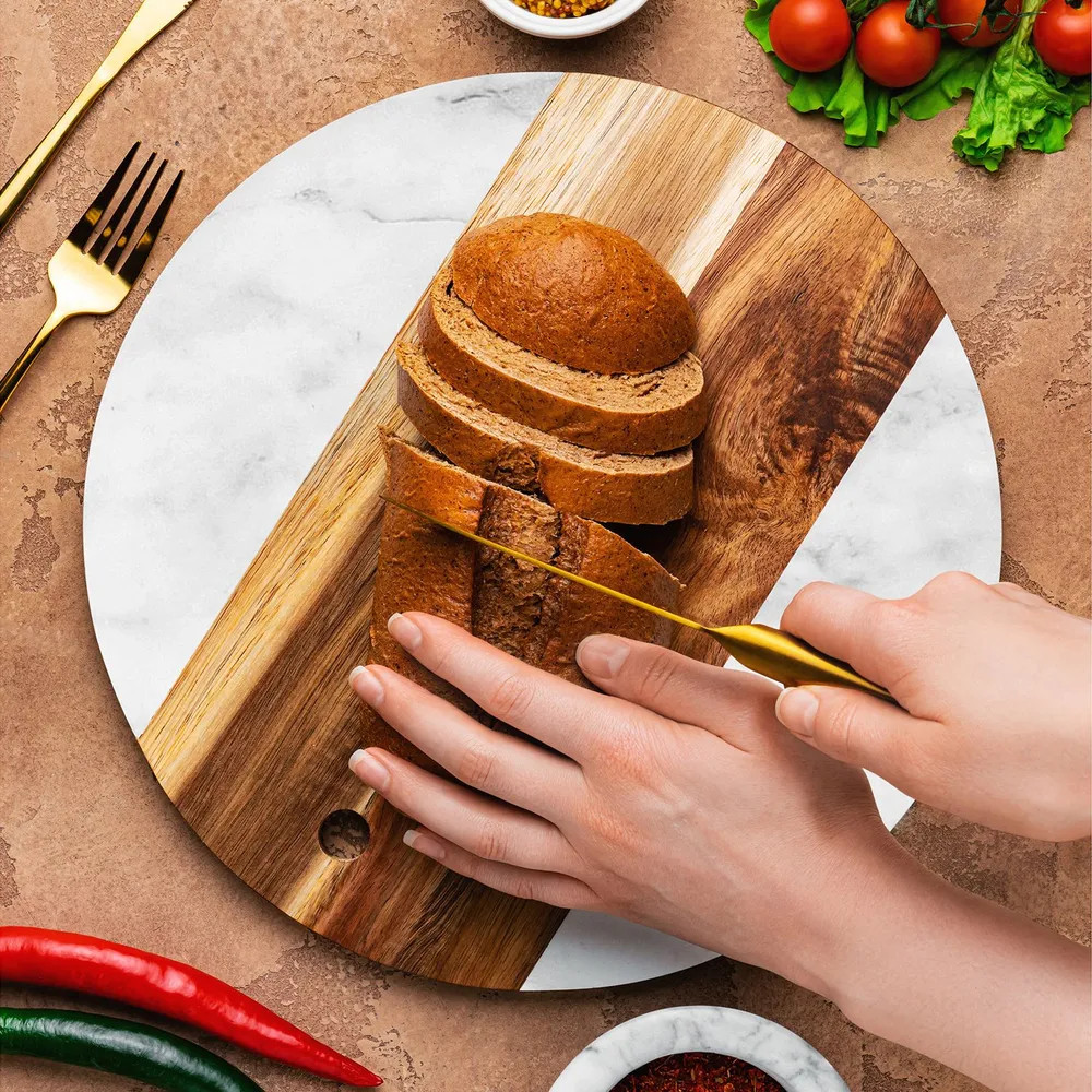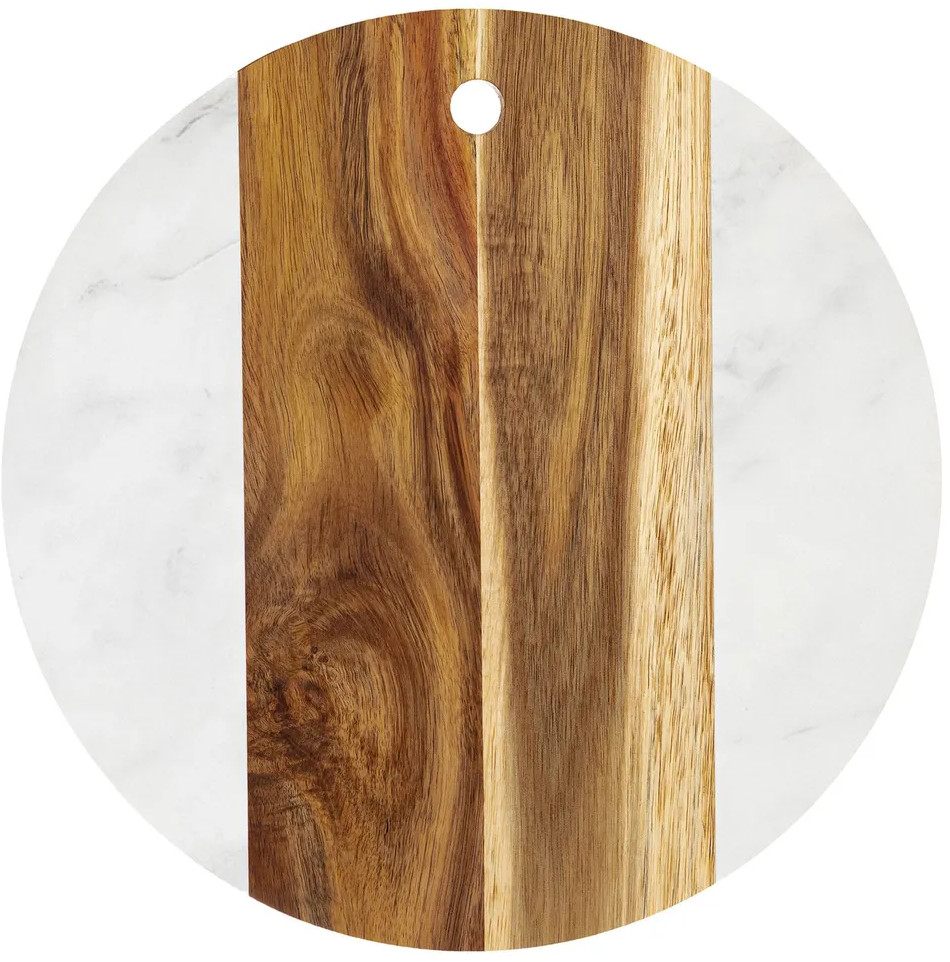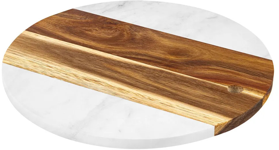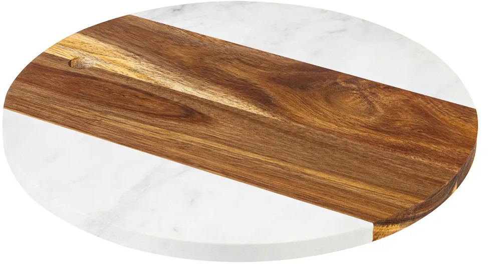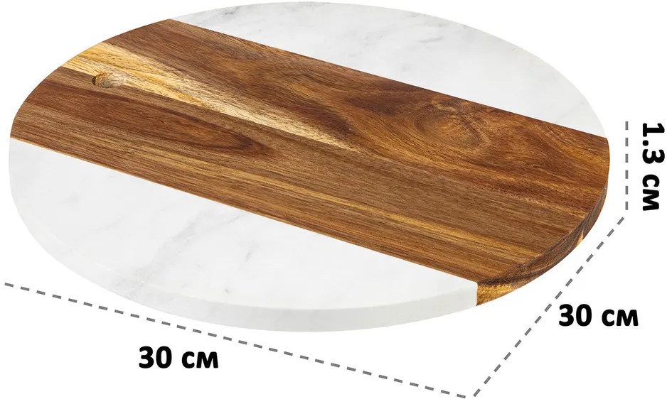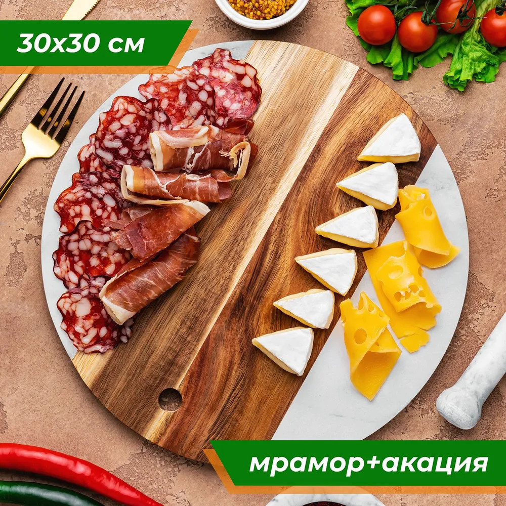 Доска для разделки и сервировки выполнена из натурального дерева акации и настоящего камня мрамора. Сервировочный кухонный аксессуар подойдет для эстетичной подачи на стол сыра к вину, нарезки, пиццы, закусок, стейков, шашлыка, суши, роллов, сухофруктов, выпечки, сладостей и другой еды и продуктов. Можно использовать в роли необычного подноса или декоративной подставки.