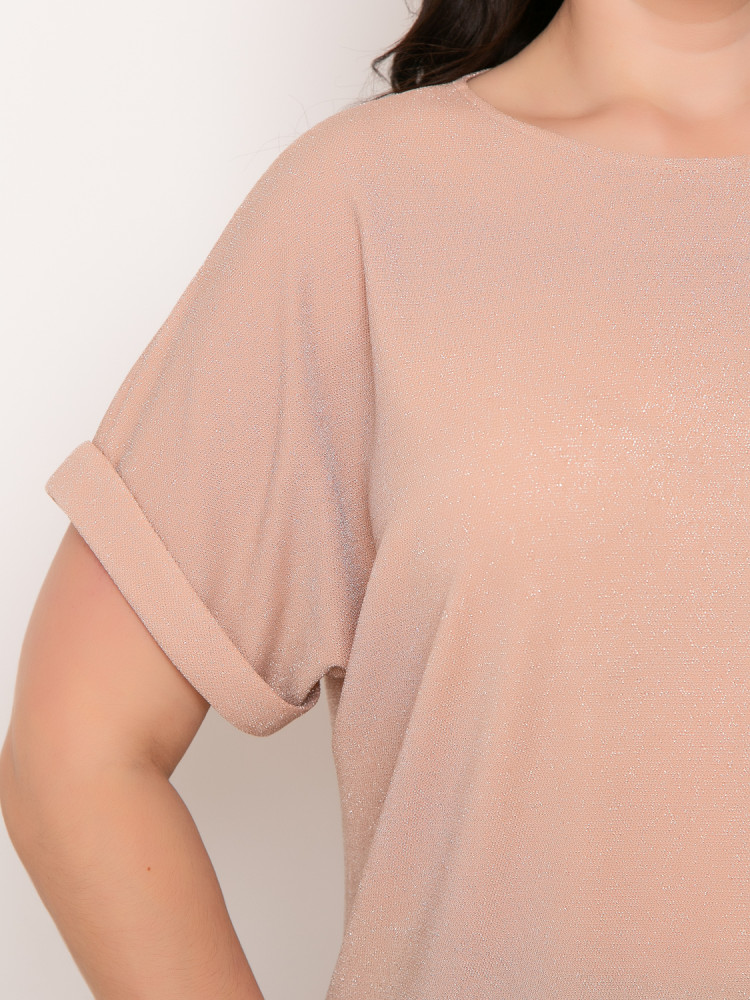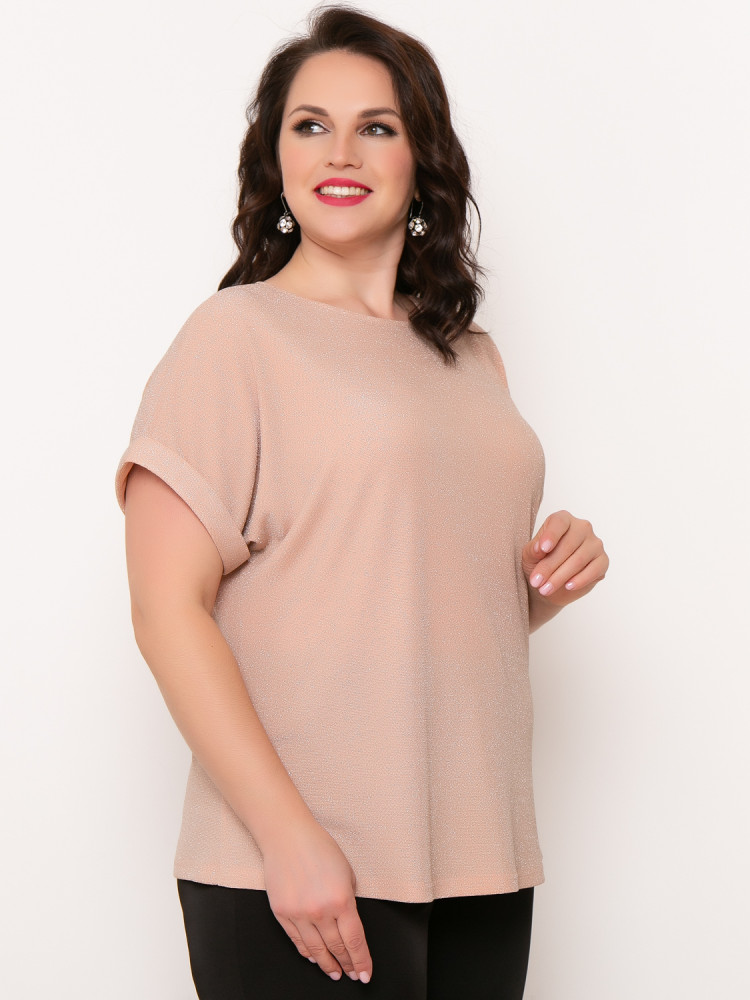 Блузка блестящая, праздничная, если хорошо приблизить фото, то будет видно блеск, цвет немного светлее из-за блеска, я бы сказала телесный. Идёт в размер, даже чуть свободнее.