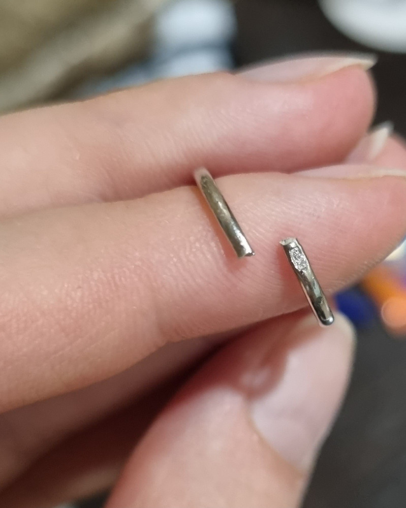 Кольцо сломалось. На середине кольца стоит метка с пробой. Именно там металл оказался настолько тонким, что Кольцо сломалось во время носки. Фото прилагаю