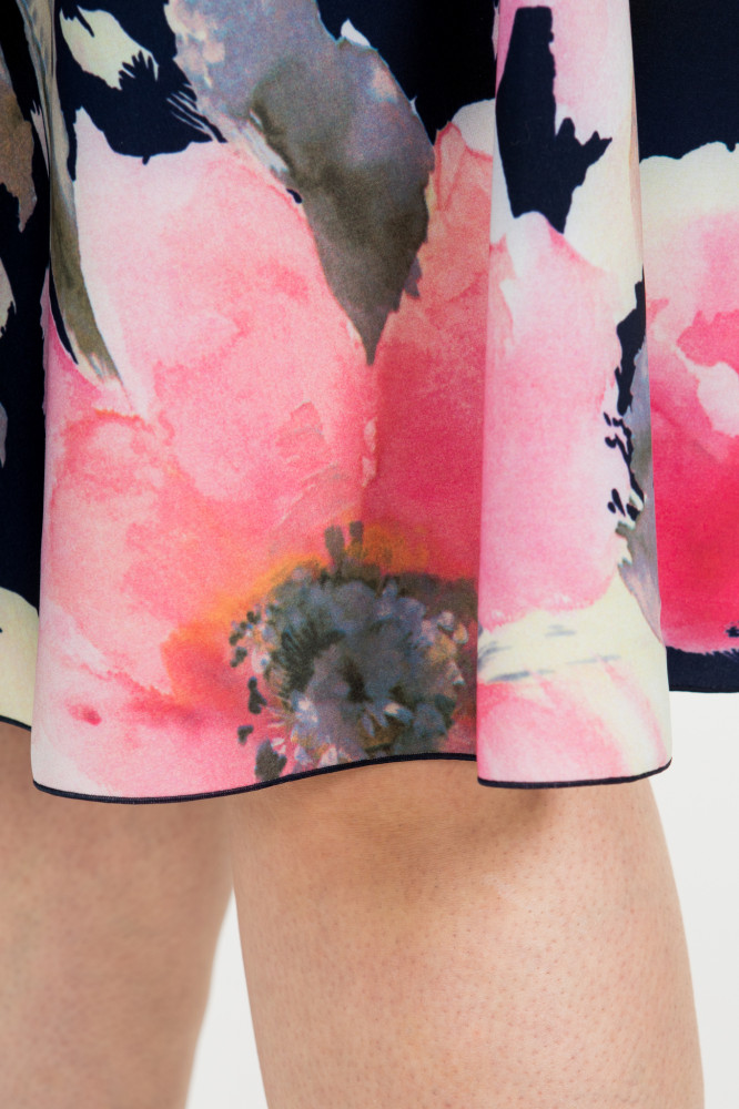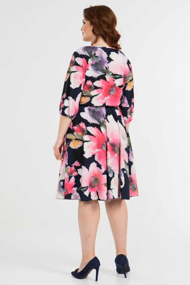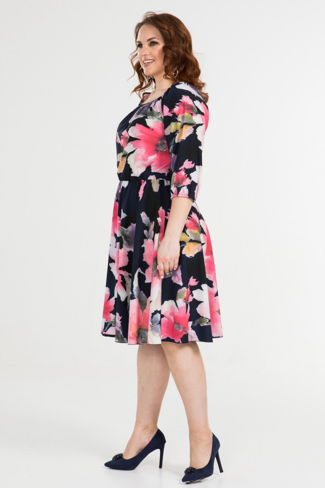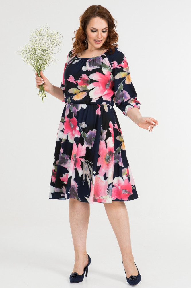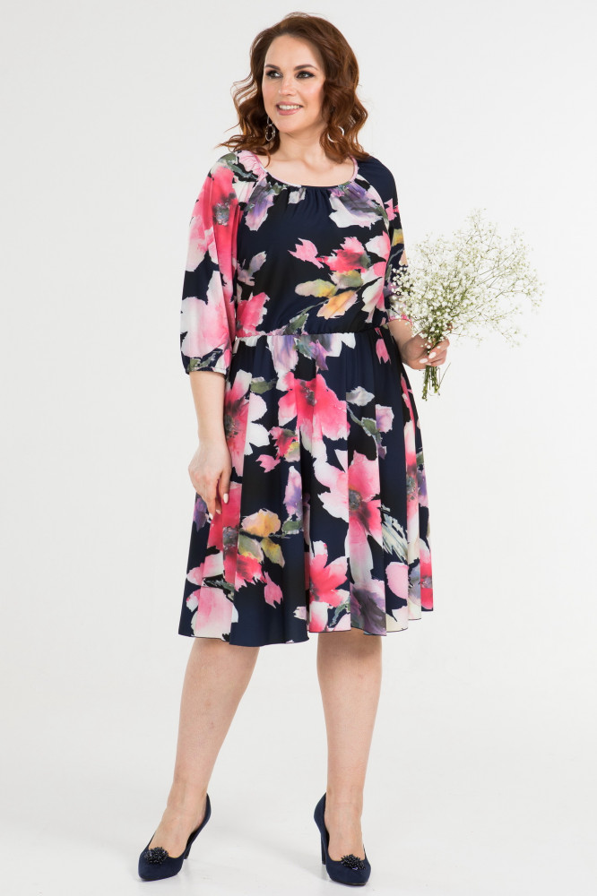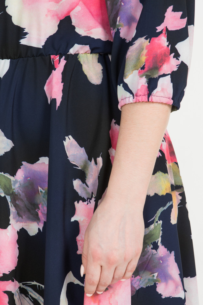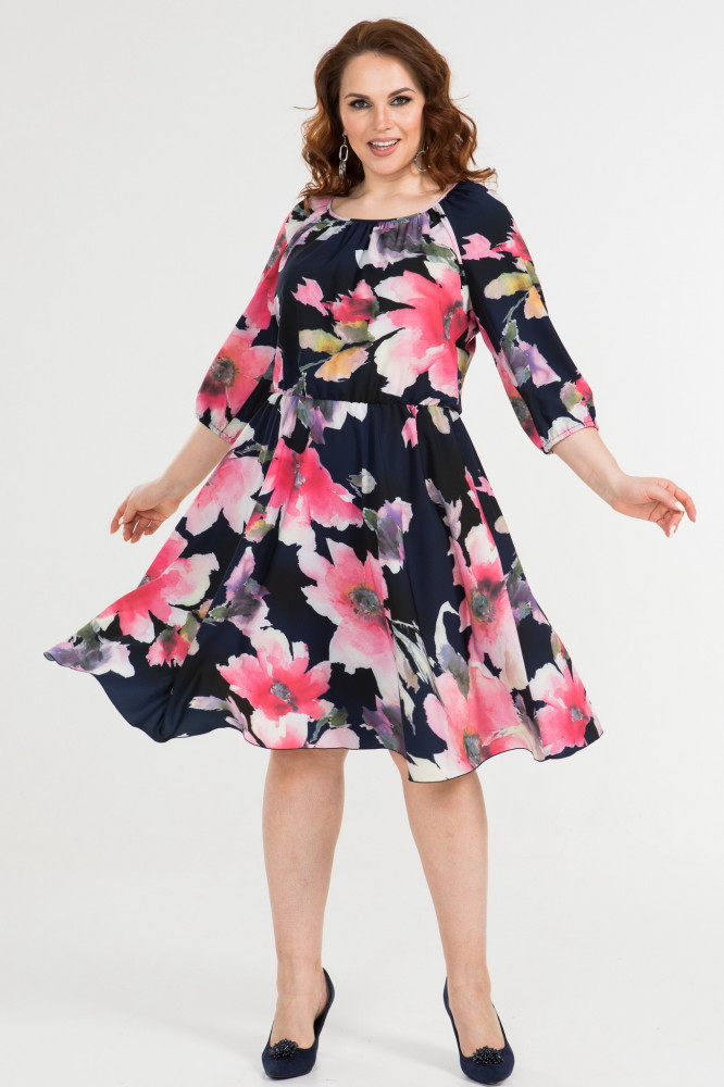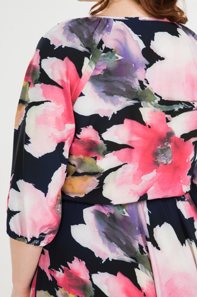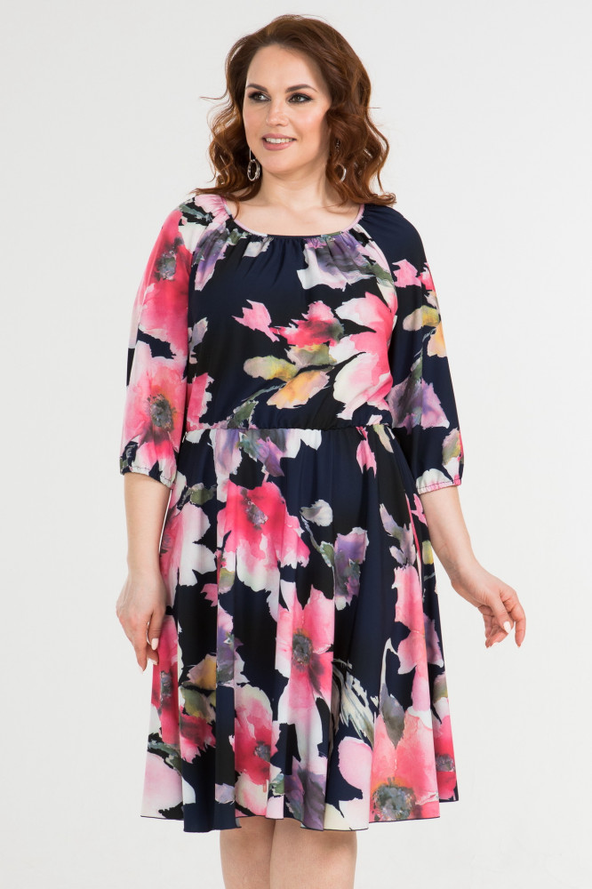 Платье отрезное по линии талии. Наименование ткани — ниагра. Рукав реглан, 3/4. Горловина переда и спинки собрана в сборку. Силуэт трапециевидный. Рост модели на фото — 172 см.