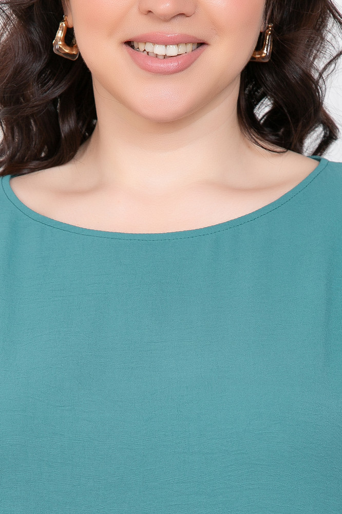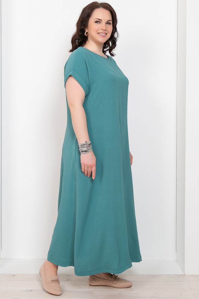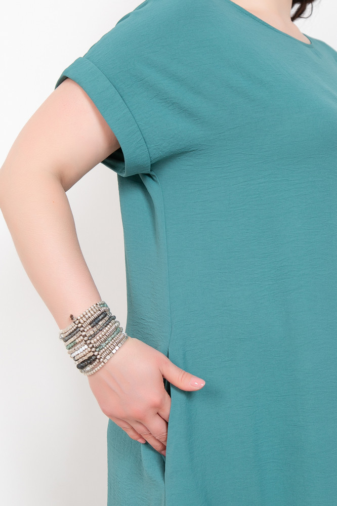 Платье женское А-образного силуэта, с карманами в боковом шве. Горловина круглая, рукав цельнокроенный, короткий, на притачной манжете. Изделие изготовлено из плотной шелковистой ткани с жатой фактурой.