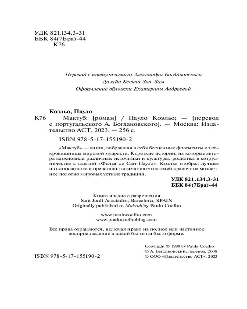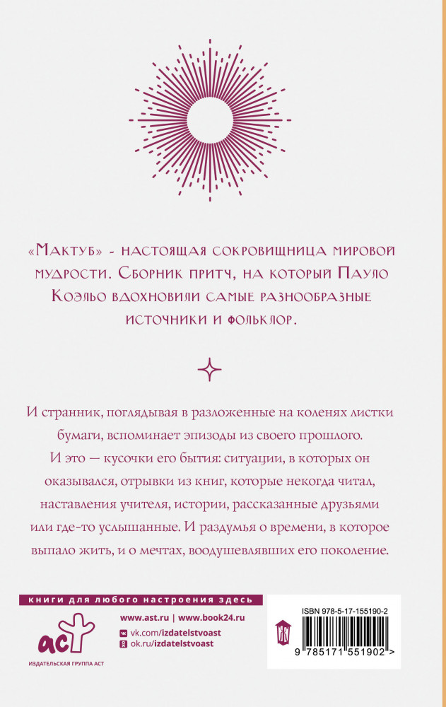 💳 Оплатить за товар можно при получении 🇰🇿 Есть бесплатная доставка по Казахстану от 1 дня 🎁 Копите бонусы с каждой покупки Серия: Коэльо. Классика «Мактуб» — книга, вобравшая в себя бесценные фрагменты из сокровищницы мировой мудрости. Короткие истории, на которые автора вдохновили различные источники и культуры, родились в сотрудничестве с газетой «Фолья де Сан-Пауло». Коэльо отобрал лучшее из написанного и представил вниманию читателей красочное мозаичное полотно мировых устных традиций. |