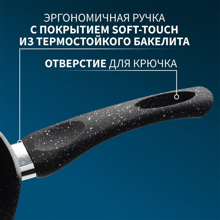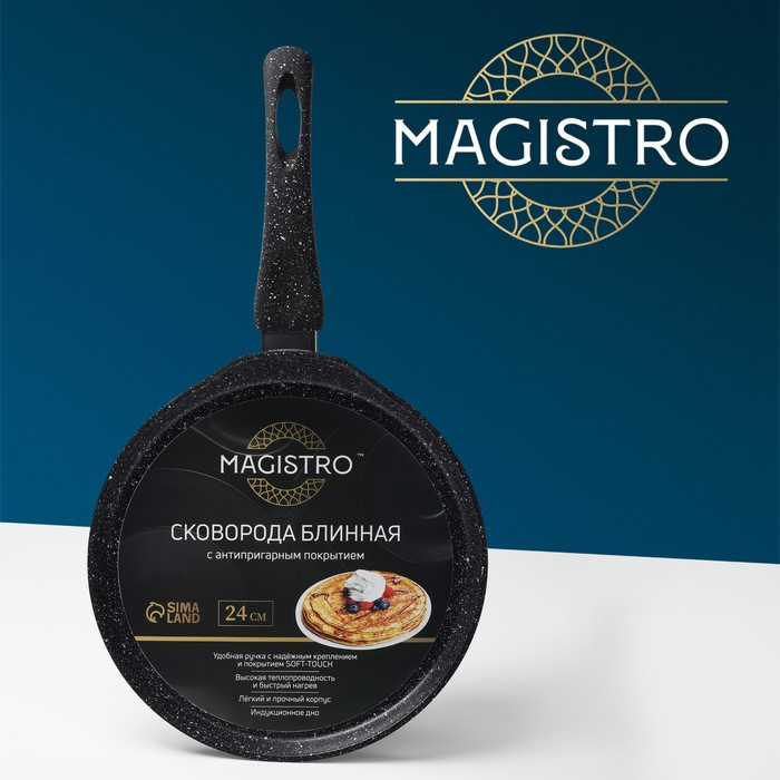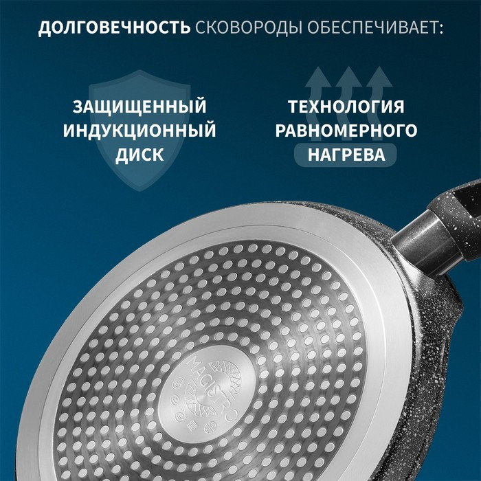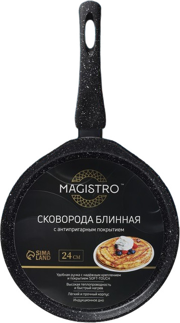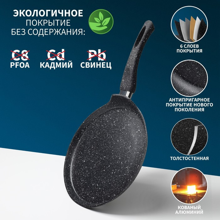 Сковорода Magistro серии «Dark» изготовлена из кованого алюминия и имеет сверхпрочное антипригарное покрытие, усиленное частичками мрамора. Покрытие полностью безопасно для здоровья, не содержит PFOA и других вредных веществ. В такой сковороде удобно жарить блины, оладьи, панкейки. Благодаря надежному антипригарному покрытию на сковороде можно готовить с минимальным количеством масла: продукты не прилипнут, не подгорят.