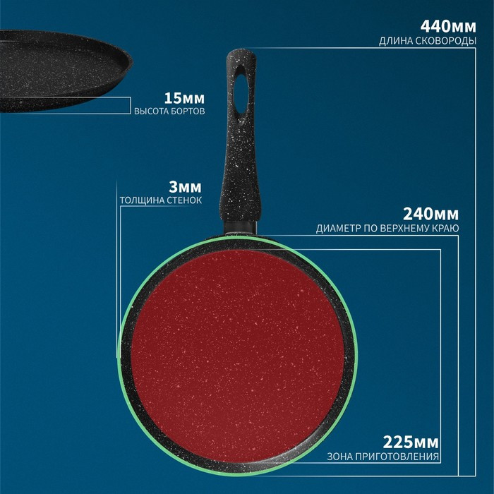 • высококачественный кованый алюминий с толстым дном 3 мм сохранит форму изделия даже если сковородка была перегрета;