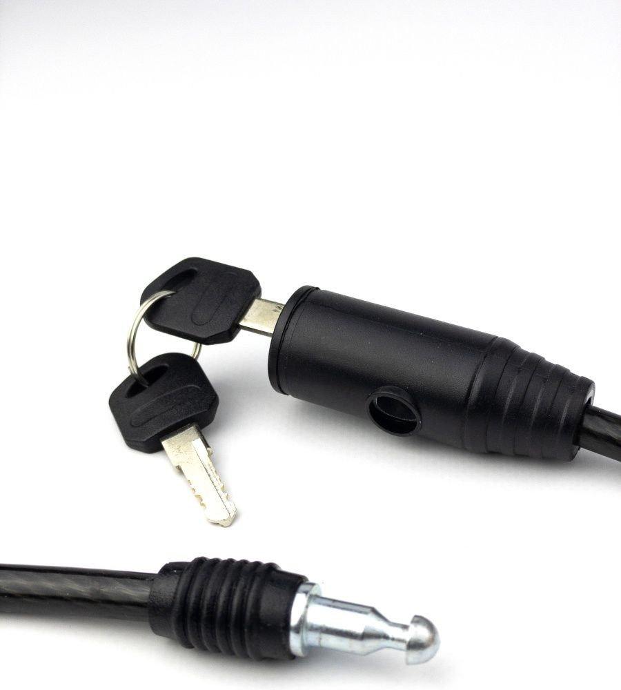 Надежный замок для велосипеда. Тросовый противоугонный замок подходит для велосипедов, самокатов, детских колясок. Механический, не кодовый, фиксатор запирается без ключа. Отпирание ключом классическое, не нужно запоминать код. Пластиковое покрытие защищает замок от влаги и предотвращает возникновение коррозии. Легкий, прочный и удобный в использовании.