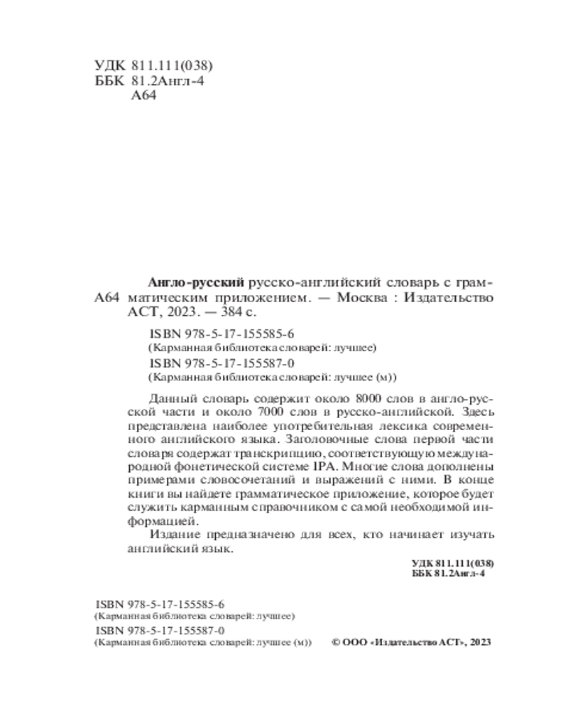 💳 Оплатить за товар можно при получении 🇰🇿 Есть бесплатная доставка по Казахстану от 1 дня 🎁 Копите бонусы с каждой покупки Серия: Карманная библиотека словарей: лучшее Данный словарь содержит около 8000 слов в англо-русской части и около 7000 слов в русско-английской. Здесь представлена наиболее употребительная лексика современного английского языка. Заголовочные слова первой части словаря содержат транскрипцию, соответствующую международной фонетической системе IPA. Многие слова дополнены примерами словосочетаний и выражений с ними. В конце книги вы найдете грамматическое приложение, которое будет служить карманным справочником с самой необходимой информацией. |