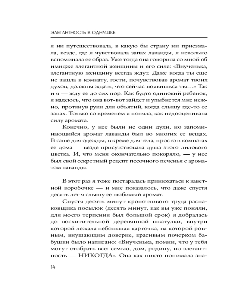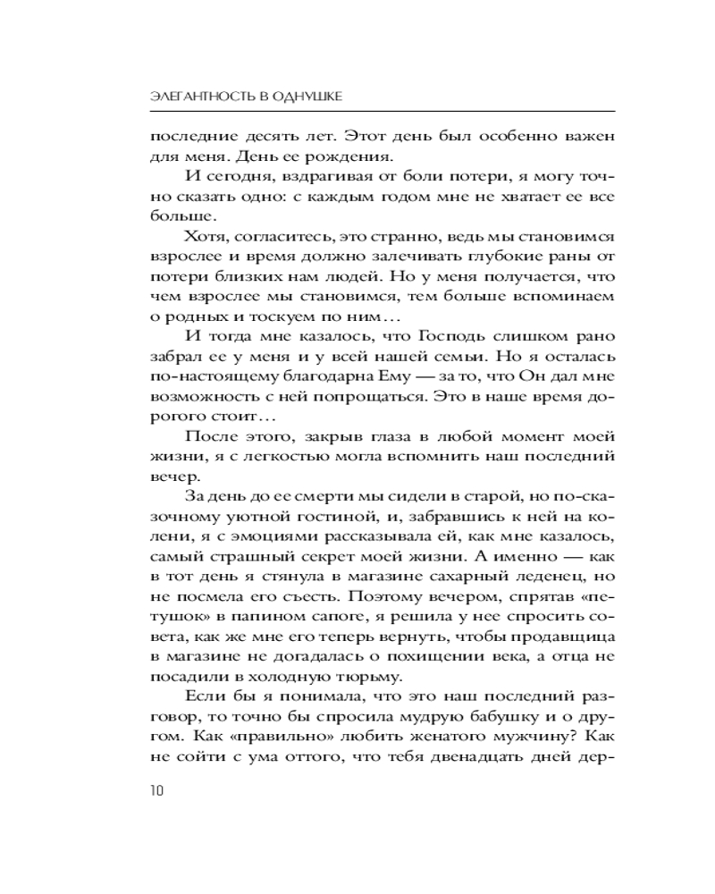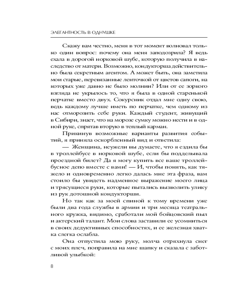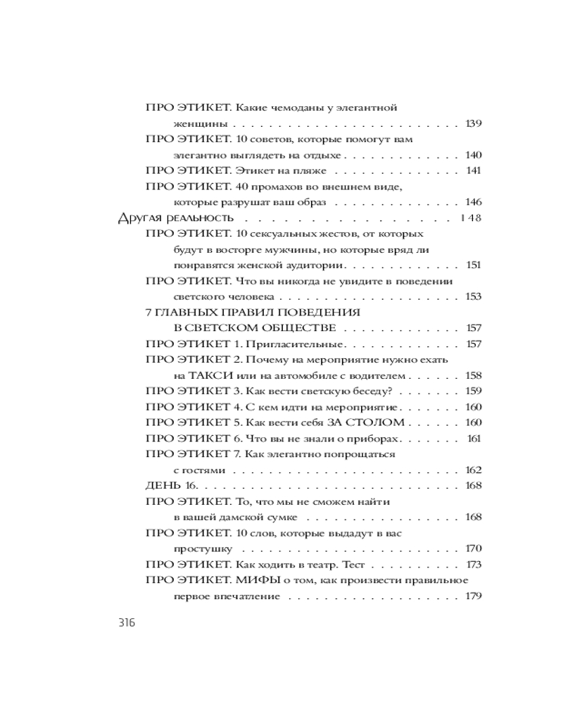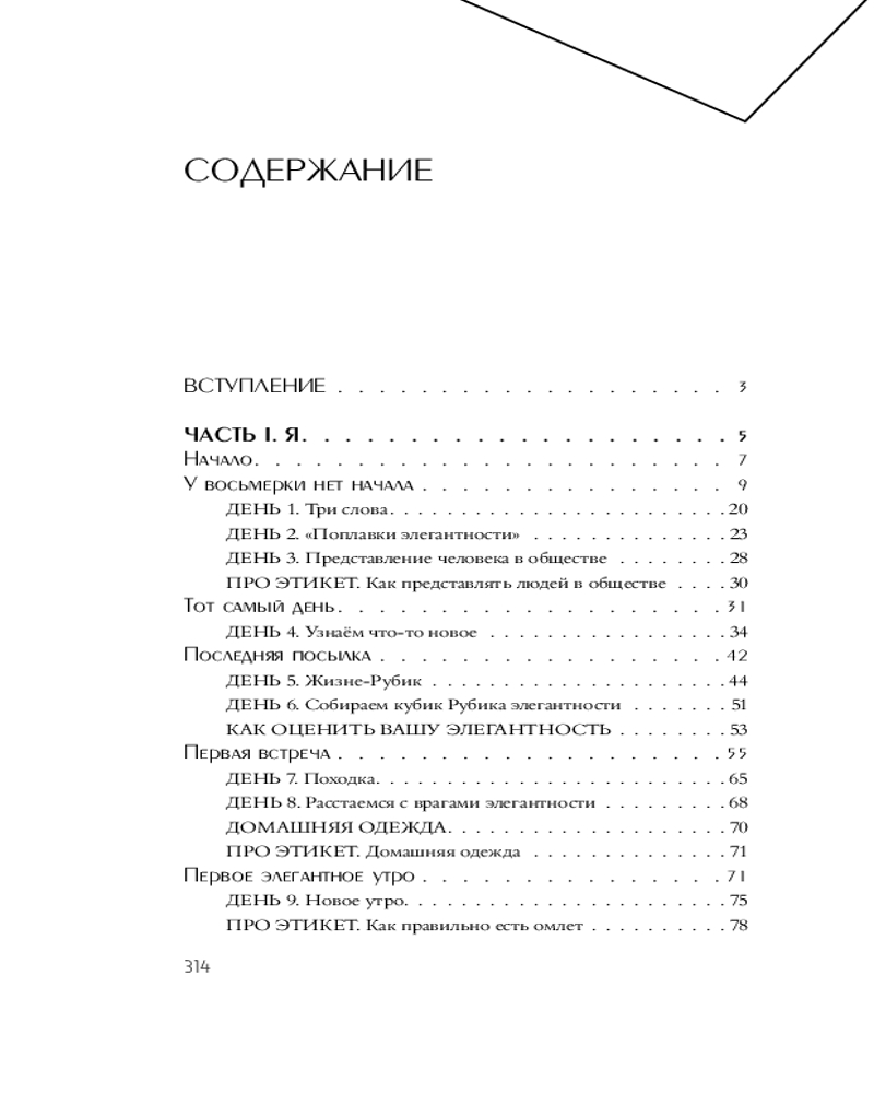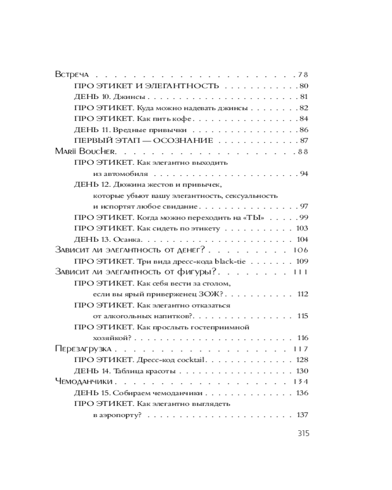 Хорошо рассказано про элегантность и правила этикета. Художественная часть книги переплетается с правилами этикета, а также сопровождается практическими заданиями для развития своей элегантности и тестов на знание этикета. Худ.история странная по содержанию, но благодаря ей пункты и правила этикета запоминаются гораздо быстрее и прочнее, так как показаны на практике.