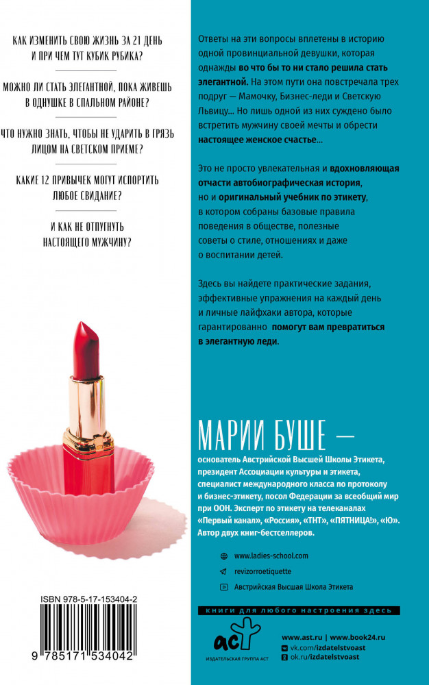 Элегантность в однушке. Промахи в этикете, которые выдадут в вас простушкуВ данный момент этот товар отсутствует в продаже. Возможно, у нас найдется аналогичный или похожий товар здесь. Серия: Школа леди Как изменить свою жизнь за 23 дня и при чем тут кубик Рубика? |