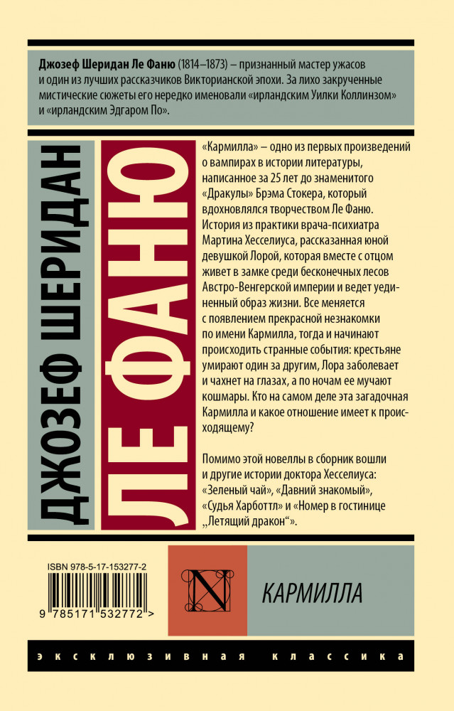 💳 Оплатить за товар можно при получении 🇰🇿 Есть бесплатная доставка по Казахстану от 1 дня 🎁 Копите бонусы с каждой покупки Серия: Эксклюзивная классика «Кармилла» — одно из первых произведений о вампирах в истории литературы, написанное за 25 лет до знаменитого «Дракулы» Брэма Стокера, который вдохновлялся творчеством Ле Фаню. |
