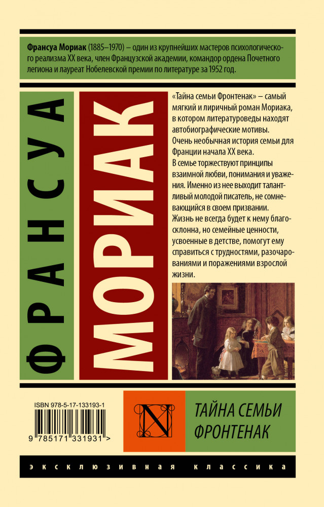 💳 Оплатить за товар можно при получении 🇰🇿 Есть бесплатная доставка по Казахстану от 1 дня 🎁 Копите бонусы с каждой покупки Серия: Эксклюзивная классика «Тайна семьи Фронтенак» — самый мягкий и лиричный роман Мориака, в котором литературоведы находят автобиографические мотивы. Очень необычная история семьи для Франции начала ХХ века. В семье торжествуют принципы взаимной любви, понимания и уважения. Именно из нее выходит талантливый молодой писатель, не сомневающийся в своем призвании. Жизнь не всегда будет к нему благосклонна, но семейные ценности, усвоенные в детстве, помогут ему справиться с трудностями, разочарованиями и поражениями взрослой жизни. |