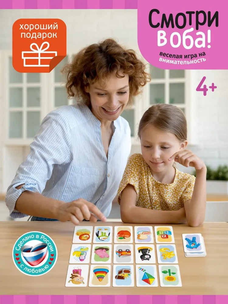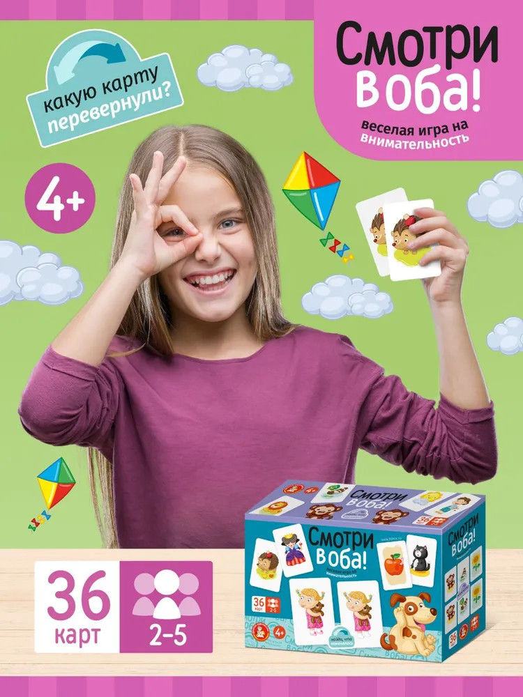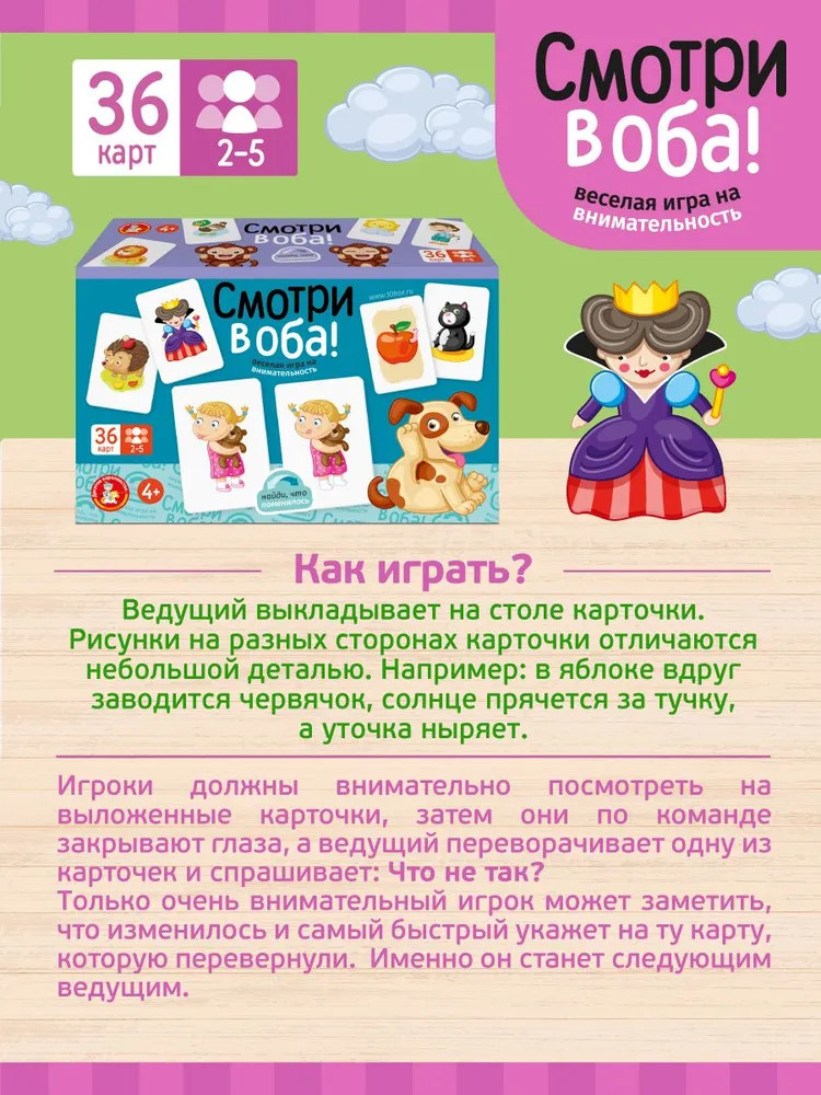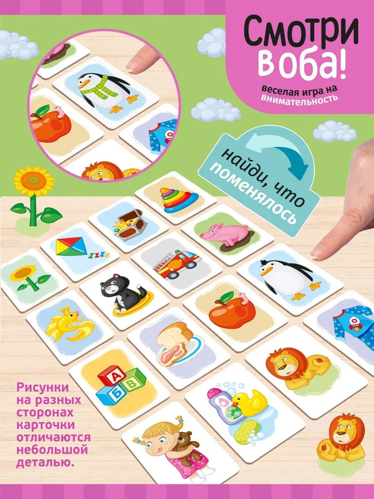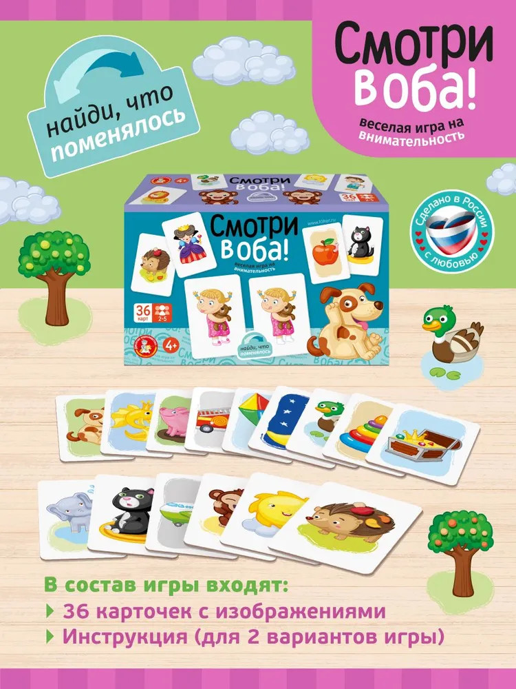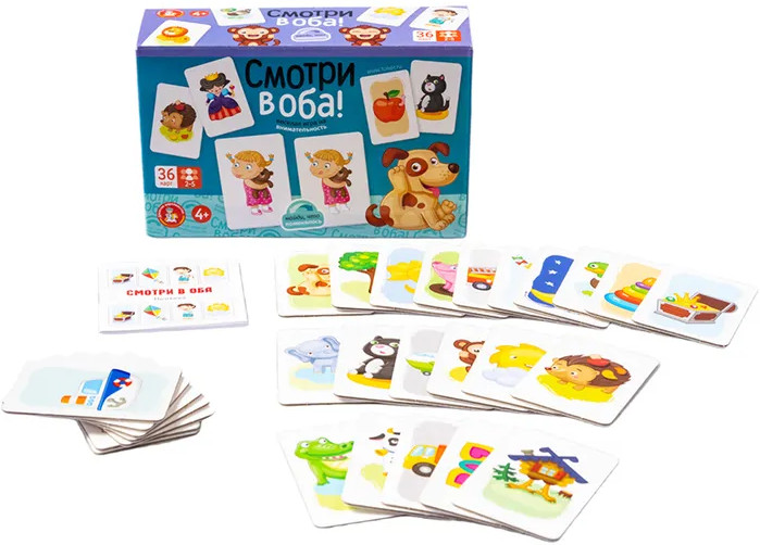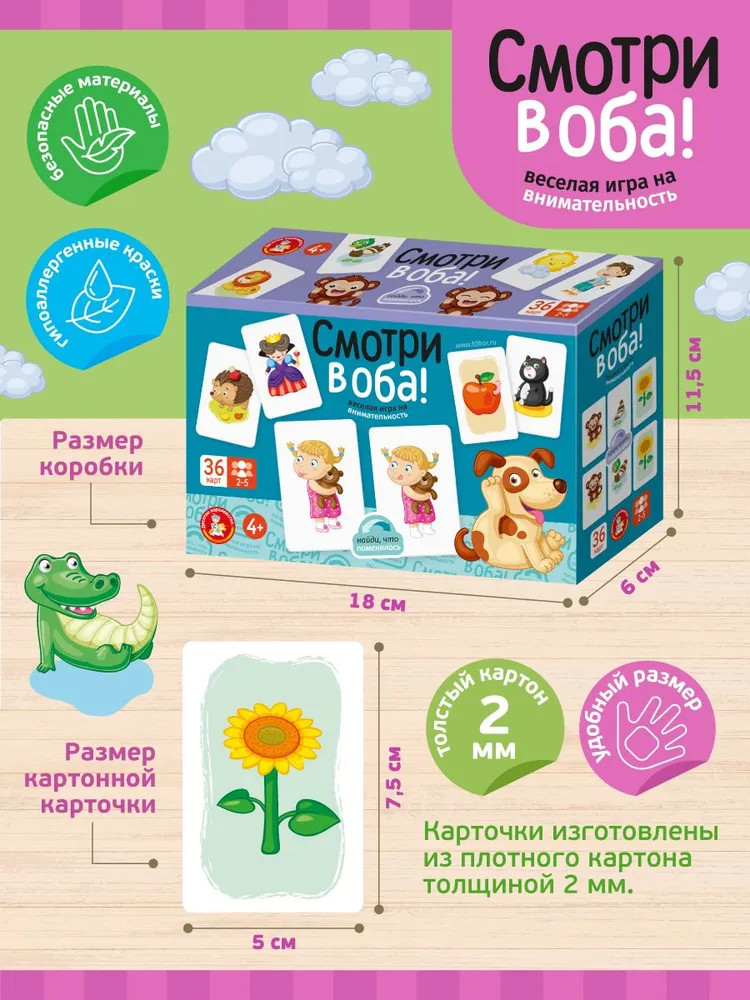 Увлекательная игра «Смотри в оба» обязательно понравится детям и позволит интересно и с пользой провести время в компании. В игре могут участвовать от 2 до 5 игроков. Побеждает самый быстрый и внимательный. Карточки изготовлены из плотного картона толщиной 2 мм с нанесенным ярким рисунком. |