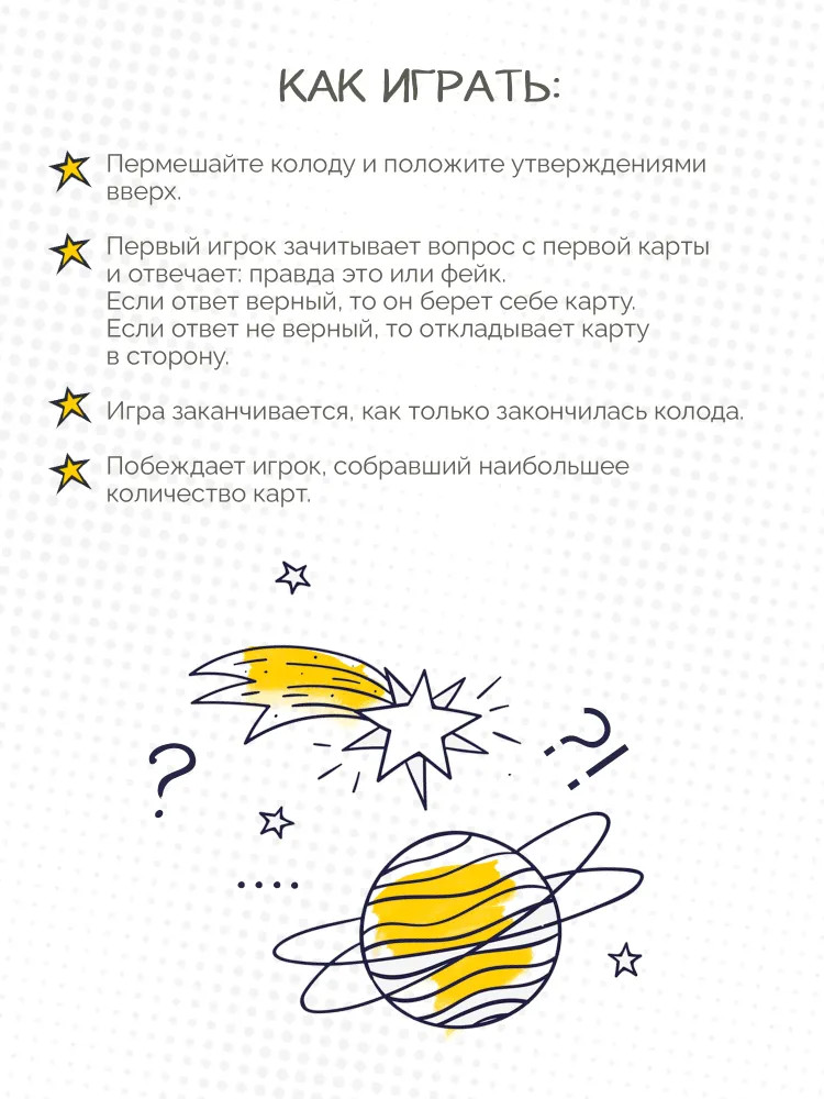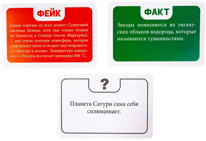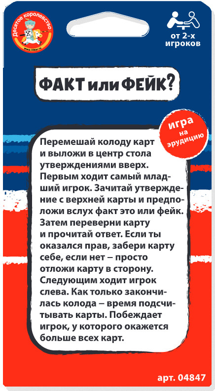 Правила игры: перемешайте колоду и положите утверждениями вверх. Первый игрок зачитывает вопрос с первой карты и отвечает: правда это или фейк. Если ответ верный, то он берет себе карту. Если ответ не верный, то откладывает карту в сторону. Игра заканчивается как только закончилась колода. Побеждает игрок, собравший наибольшее количество карт. Игра развивает внимательность, расширяет кругозор и сплачивает друзей.