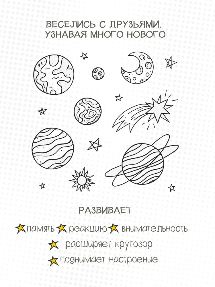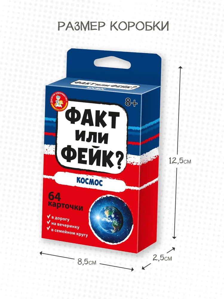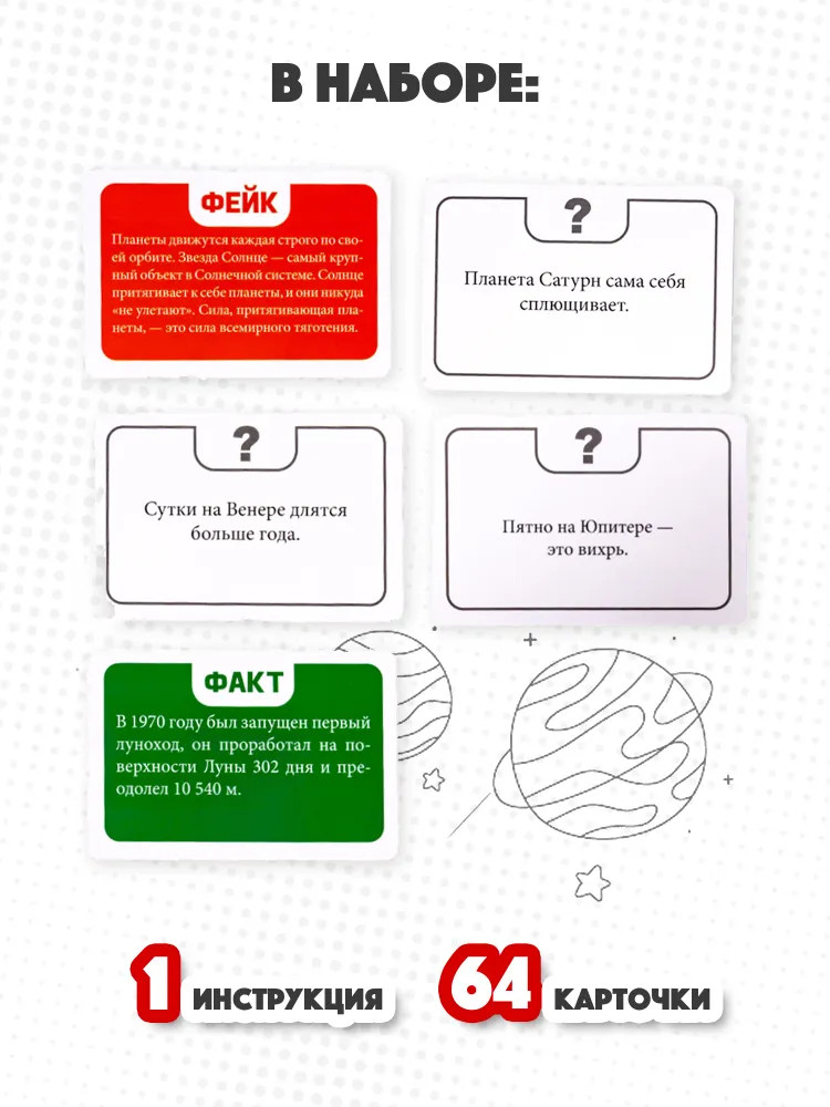 Детская настольная игра для большой компании Факт или Фейк «Космос» — это интересная игра в удобном формате, которую можно взять с собой на вечеринку, в гости или в дорогу. С этой игрой вы проверите уровень знаний о космосе и интересно проведете время в компании.