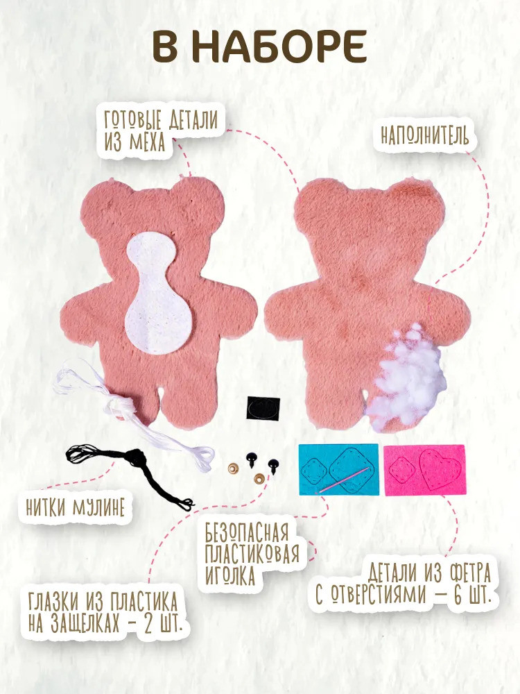 💳 Оплатить за товар можно при получении 🇰🇿 Есть бесплатная доставка по Казахстану от 1 дня 🎁 Копите бонусы с каждой покупки Мягкая игрушка из меха и фетра «Медвежонок» , сделанная своими руками — это отличная идея для подарка! С данным набором вы легко самостоятельно сошьете красивую игрушку. Все необходимое есть в данном наборе. |