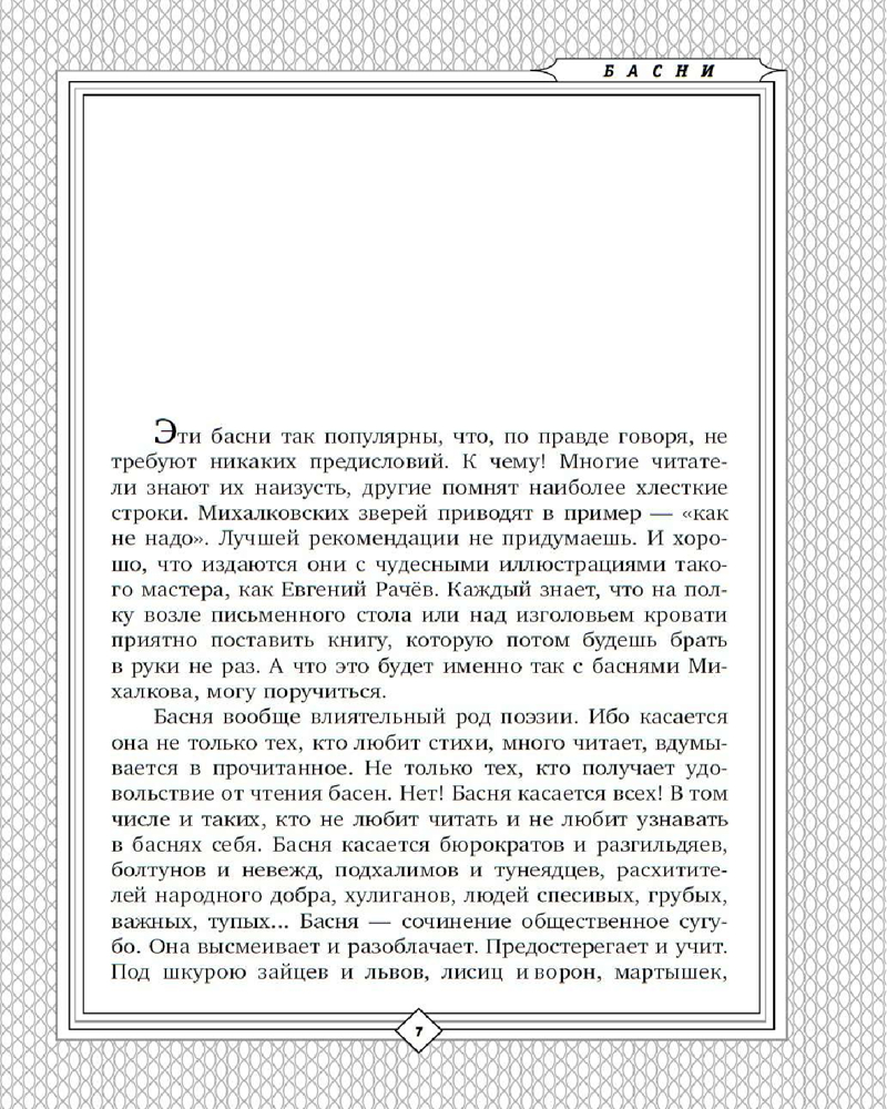 В книгу вошли цветные иллюстрации народного художника РСФСР Евгения Рачёва к избранным произведениям. За иллюстрации к басням художник стал Лауреатом Государственной премии РСФСР, а лирику и военные стихотворения прекрасно дополняют его пейзажи и фронтовые зарисовки.