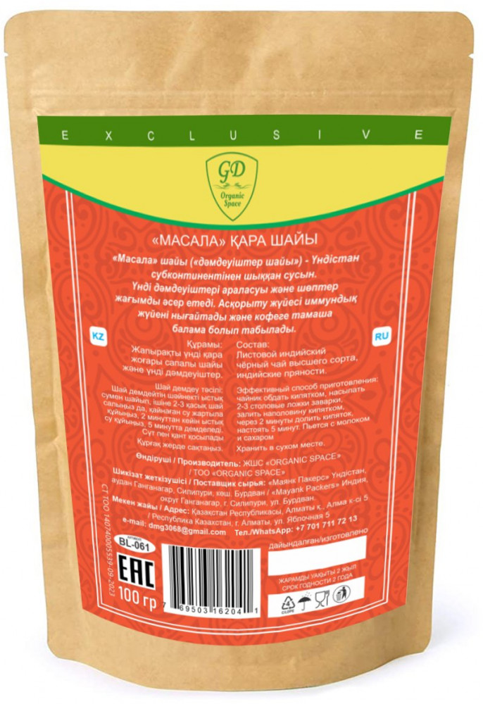Organic Space GD Чай черный «Масала»В данный момент этот товар отсутствует в продаже. Возможно, у нас найдется аналогичный или похожий товар здесь. Купаж уникального вкусового букета, индийского черного листового чая высшего сорта с индийскими пряностями. Чай масала (буквально «чай со специями») — напиток родом с Индийского субконтинента, получаемый путём заваривания чая со смесью индийских специй и трав. Продукт не содержит красителей и ГМО. Страна изготовитель — Индия, расфасовано в Казахстане. |