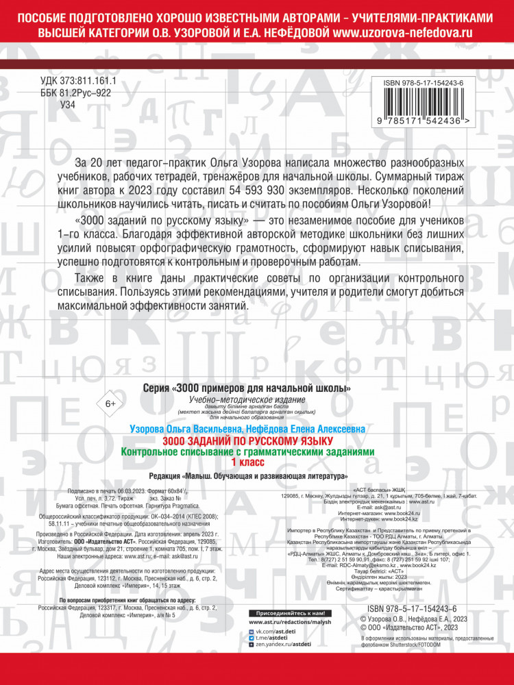 💳 Оплатить за товар можно при получении 🇰🇿 Есть бесплатная доставка по Казахстану от 1 дня 🎁 Копите бонусы с каждой покупки Серия: 3000 примеров для начальной школы «3000 заданий по русскому языку. 1 класс. Контрольное списывание с грамматическими заданиями» — это рабочая тетрадь, основанная на эффективной авторской методике известного педагога-практика О. В. Узоровой. Пособие содержит более 100 текстов для списывания, а также множество дополнительных упражнений. Выполняя задания, школьники сформируют орфографическую грамотность, успешно подготовятся к контрольным и проверочным работам. |