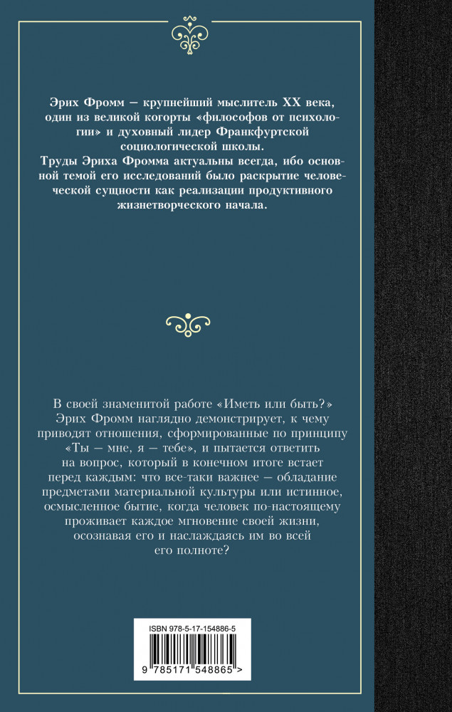 💳 Оплатить за товар можно при получении 🇰🇿 Есть бесплатная доставка по Казахстану от 1 дня 🎁 Копите бонусы с каждой покупки Серия: Лучшая мировая классика В своей знаменитой работе «Иметь или быть?» Эрих Фромм наглядно демонстрирует, к чему приводят отношения, сформированные по принципу «Ты — мне, я — тебе», и пытается ответить на вопрос, который в конечном итоге встает перед каждым: что все-таки важнее — обладание предметами материальной культуры или истинное, осмысленное бытие, когда человек по-настоящему проживает каждое мгновение своей жизни, осознавая его и наслаждаясь им во всей его полноте? |