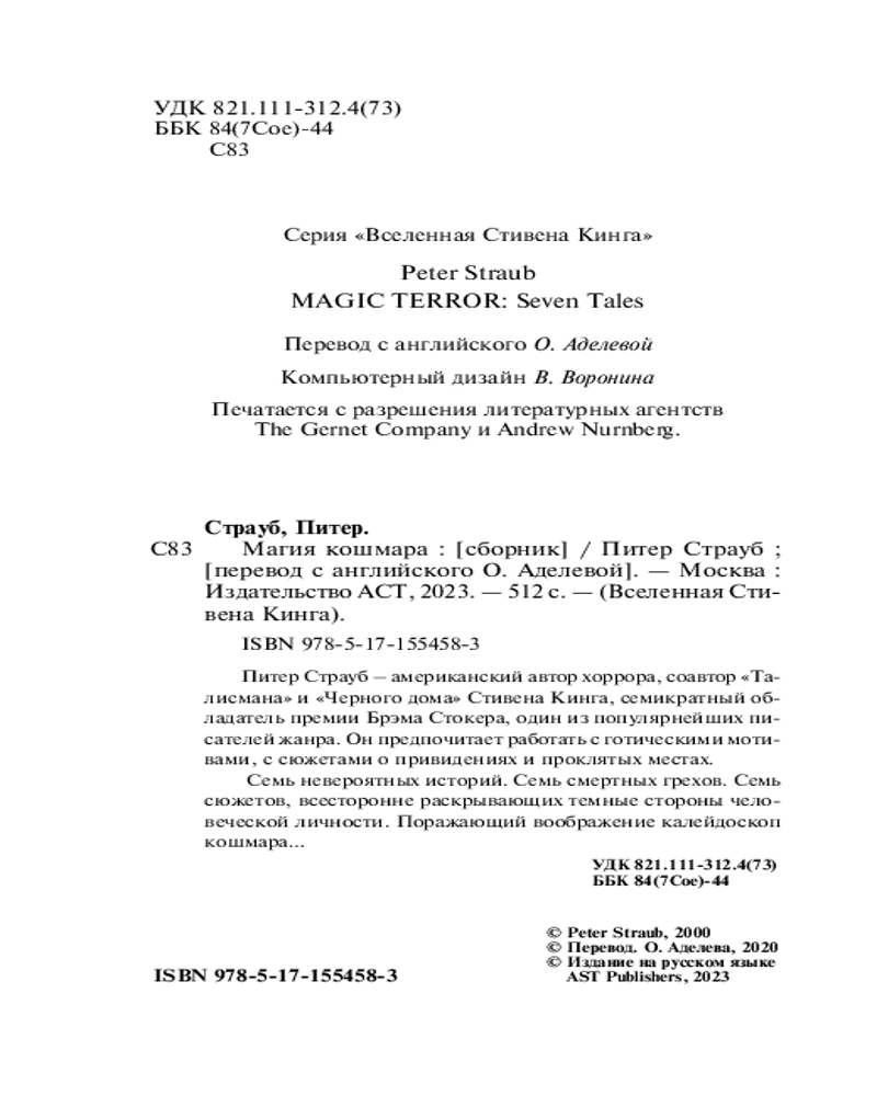 💳 Оплатить за товар можно при получении 🇰🇿 Есть бесплатная доставка по Казахстану от 1 дня 🎁 Копите бонусы с каждой покупки Серия: Вселенная Стивена Кинга (м) Питер Страуб — американский автор хоррора, соавтор «Талисмана» и «Черного дома» Стивена Кинга, семикратный обладатель премии Брэма Стокера, один из популярнейших писателей жанра. Он предпочитает работать с готическими мотивами, с сюжетами о привидениях и проклятых местах. |