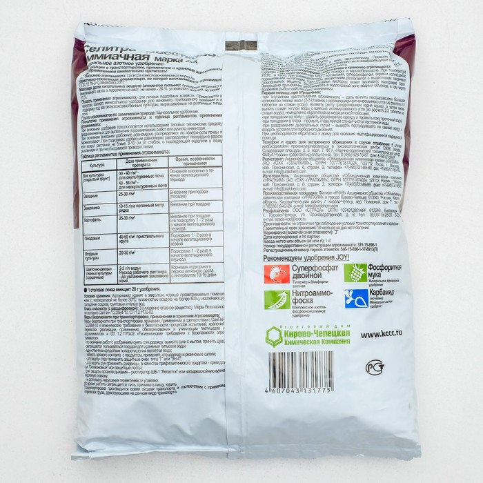 💳 Оплатить за товар можно при получении 🇰🇿 Есть бесплатная доставка по Казахстану от 1 дня 🎁 Копите бонусы с каждой покупки Удобрение легкорастворимое, невзрывоопасное и применяется для основного внесения и подкормок. По сравнению с аммиачной селитрой имеет лучшие физико-химические свойства и менее гигроскопично. Культура: рассада, овощные, плодово-ягодные, цветочно-декоративные растения. Возможно опрыскивание высаженной рассады раствором удобрения. Улучшает способность растений образовывать хлорофилл. Способствует активному развитию корней. Увеличивает активность при окислительно-восстановительных процессах. Регулирует кислотность почвы. Массовая доля питательных веществ (элементов питания): суммарная нитратного и аммонийного азота в пересчете на азот, не более −27 %, углекислого кальция, не менее −20 %. |