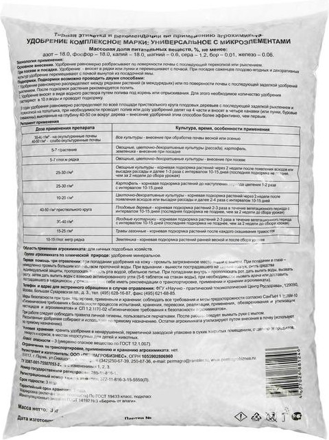 💳 Оплатить за товар можно при получении 🇰🇿 Есть бесплатная доставка по Казахстану от 1 дня 🎁 Копите бонусы с каждой покупки Удобрение «Универсальное с микроэлементами» подходит для основного внесения и подкормок всех овощных, плодово-ягодных и цветочных культур. |
