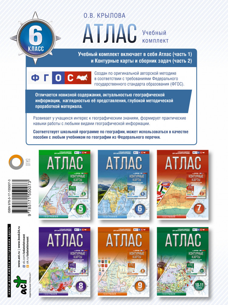 Атлас. 6 класс. ГеографияВ данный момент этот товар отсутствует в продаже. Возможно, у нас найдется аналогичный или похожий товар здесь. Серия: Атласы и контурные карты. География Атлас по географии для 6-го класса (автор — О.В. Крылова) предназначен для развития у учащихся интереса к географическим знаниям, формирования у них практических навыков работы с различными видами географической информации. Содержание материалов атласа обеспечивает дальнейшее углубление представлений учащихся о планете Земля и её оболочках, о природе, о работе с планом и картой. Оригинальные учебные задания способствуют закреплению пройденного материала, формированию у учащихся творческого начала, умения работать в группе. Предлагаемый атлас отличается новизной содержания и при этом подходит ко всем школьным программам и учебникам по географии. |