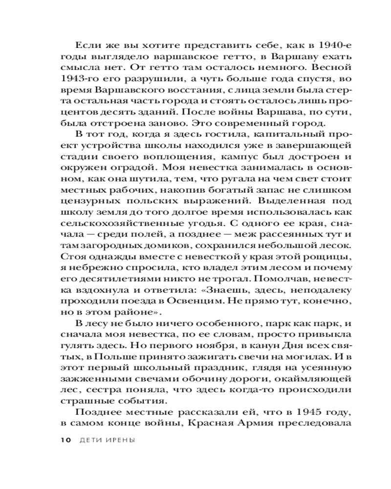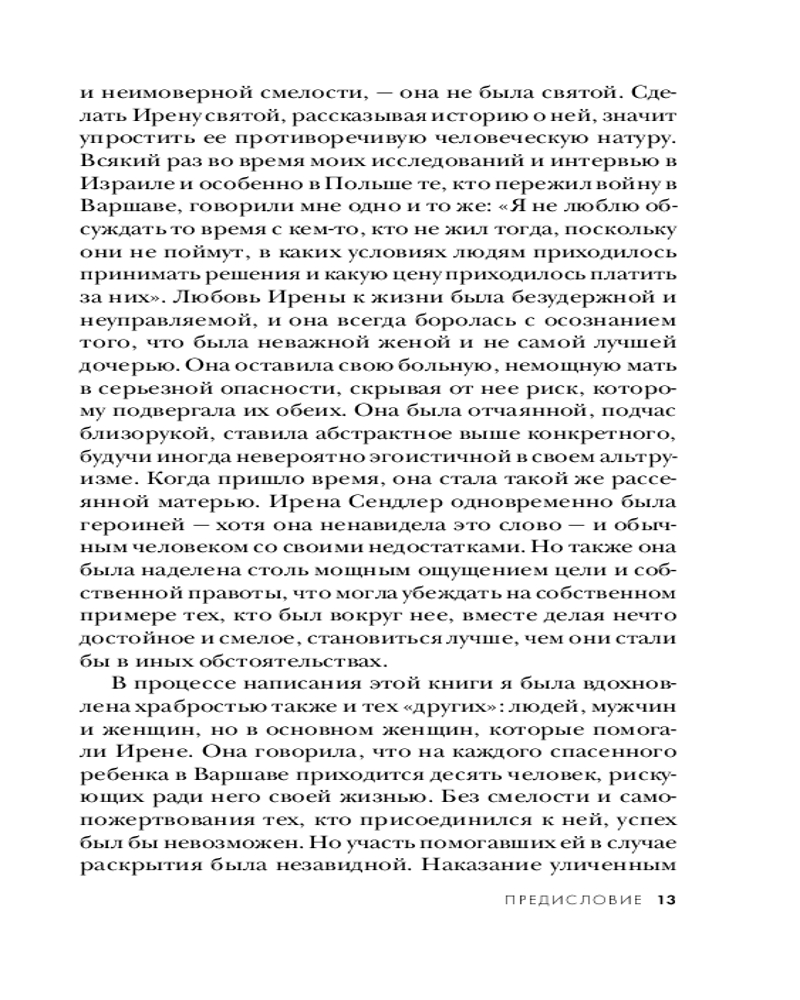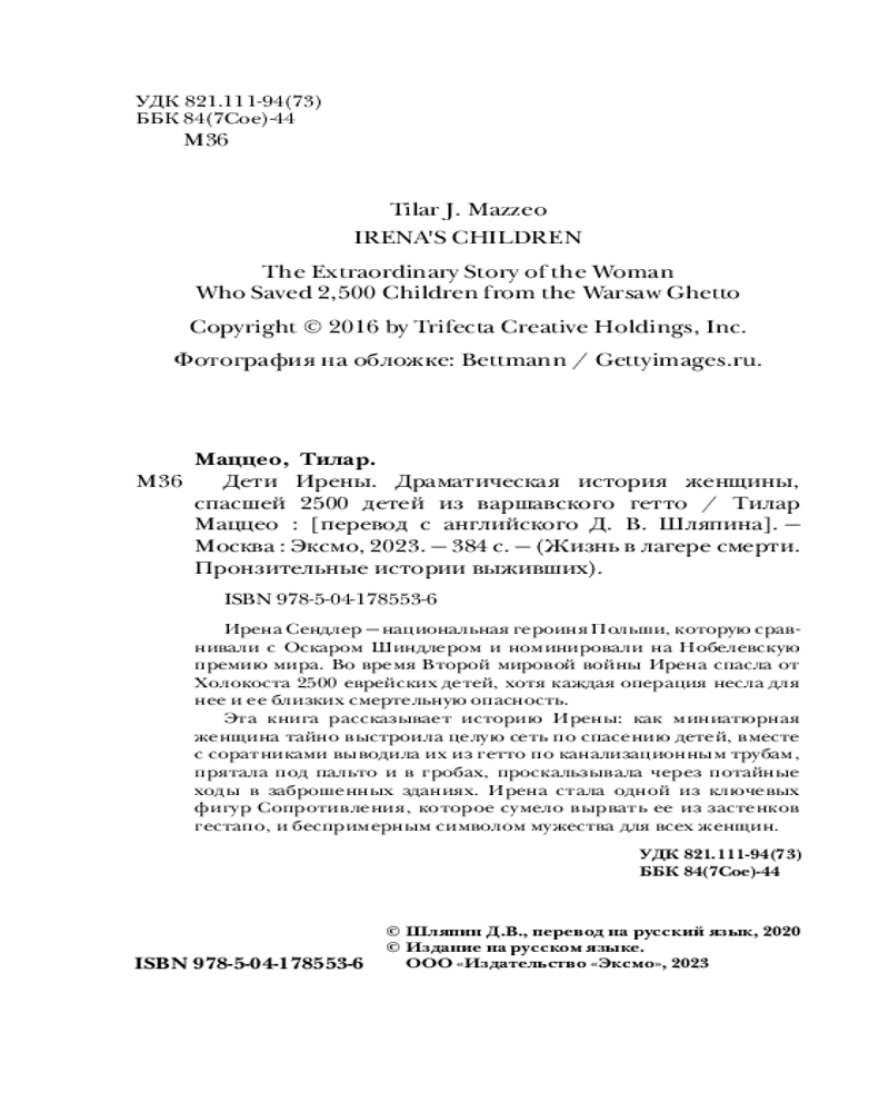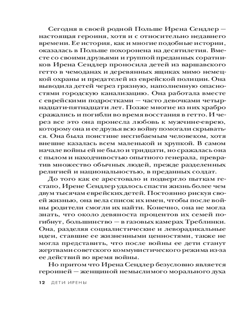 Дети Ирены. Драматическая история женщины, спасшей 2500 детей из варшавского геттоВ данный момент этот товар отсутствует в продаже. Возможно, у нас найдется аналогичный или похожий товар здесь. Серия: Жизнь в лагере смерти. Пронзительные истории выживших Ирена Сендлер — национальная героиня Польши, которую сравнивали с Оскаром Шиндлером и номинировали на Нобелевскую премию мира. Во время Второй мировой войны Ирена спасла от Холокоста 2500 еврейских детей, хотя каждая операция несла для нее и ее близких смертельную опасность. Эта книга рассказывает историю Ирены: как миниатюрная женщина тайно выстроила целую сеть по спасению детей, вместе с соратниками выводила детей из гетто по канализационным трубам, прятала под пальто и в гробах, проскальзывала через потайные ходы в заброшенных зданиях. Ирена стала одной из ключевых фигур Сопротивления, которое сумело вырвать ее из застенков гестапо, и беспримерным символом мужества для всех женщин. |