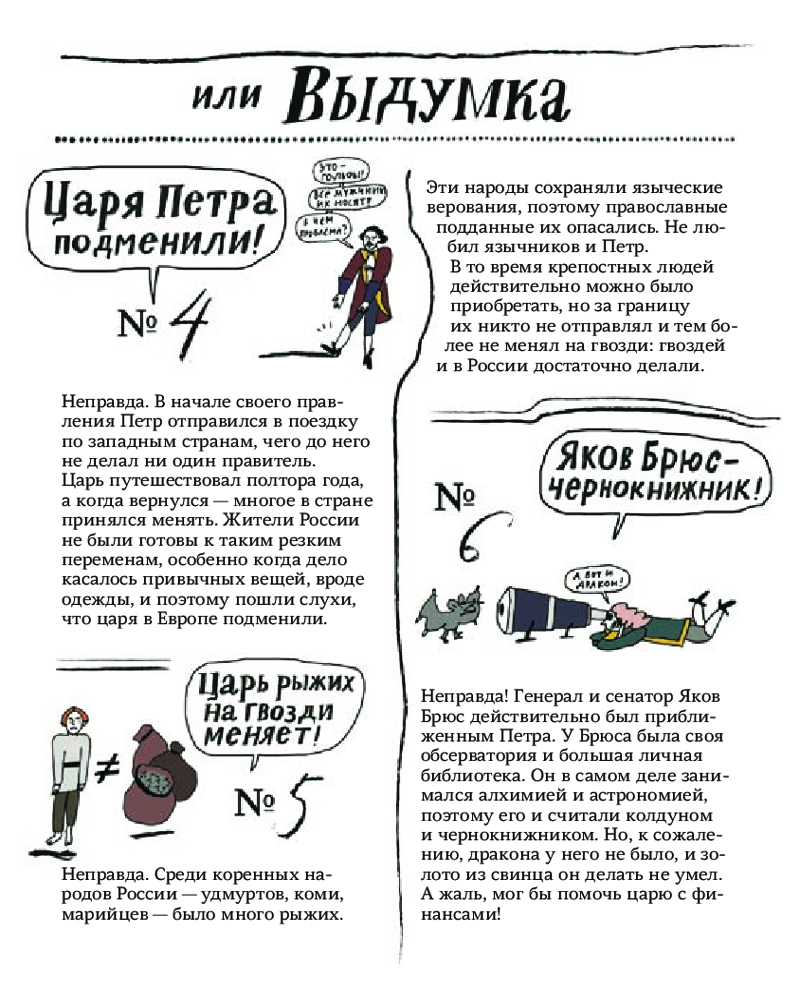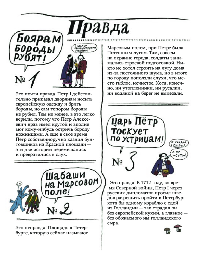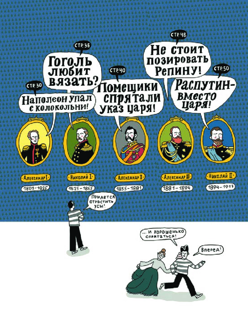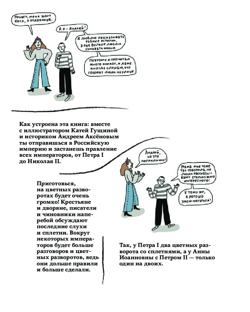 У иллюстратора Кати Гущиной и историка Андрея Аксёнова есть преимущество перед нашими предками — дистанция от той словесной суеты, которая позволяет спокойно восстановить историю, подтвердить или опровергнуть слухи о российских императорах от Петра I до Николая II.