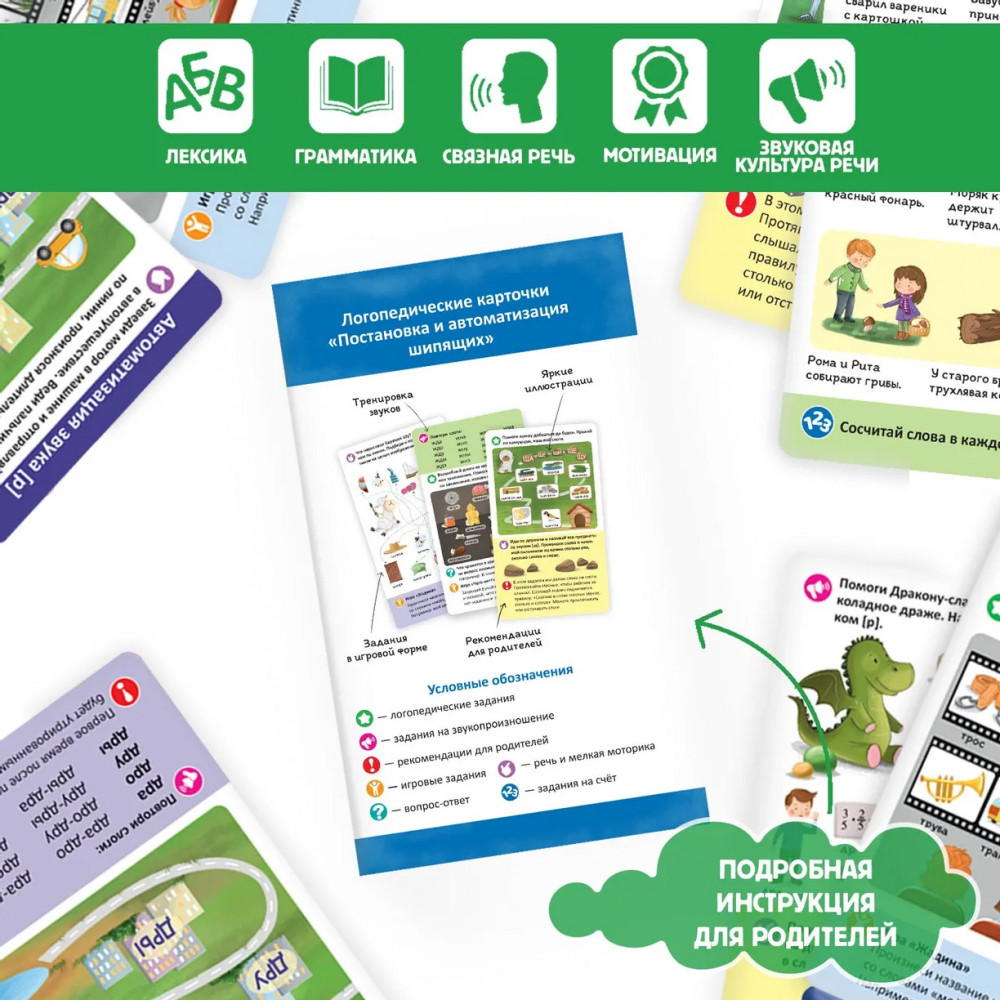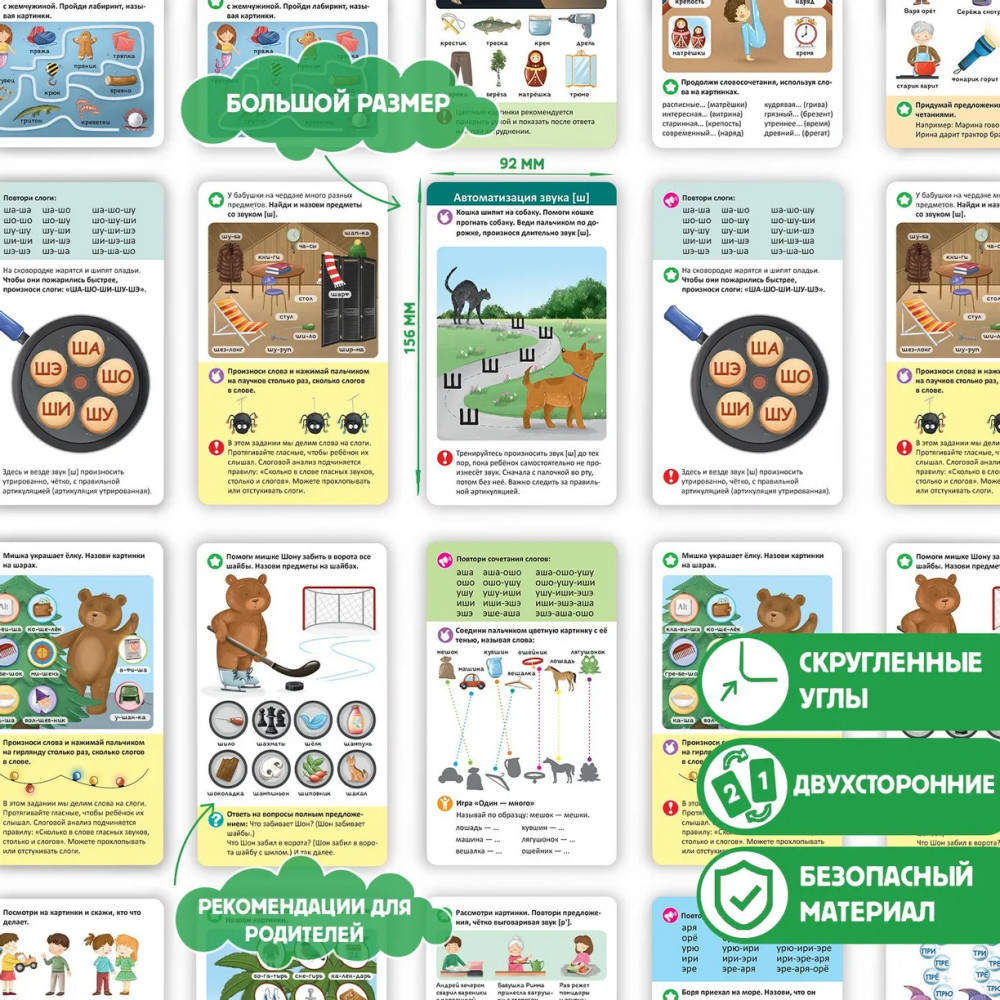 Логопедические карточки. Постановка и автоматизация шипящихВ данный момент этот товар отсутствует в продаже. Возможно, у нас найдется аналогичный или похожий товар здесь. Серия: Логопедические карточки Наборы «Логопедические карточки» от торговой марки Malamalama — это 8 наборов по 21 двусторонней карточке, 60-90 уникальных заданий в каждом наборе. В их разработке участвовала практикующий педагог-логопед. Карточки направлены на запуск речи, постановку и автоматизацию различных сложных для произношения малышами звуков. Карточки выполнены из мелованного картона, они блестящие и яркие: все задания сопровождаются красочными иллюстрациями. Внутри каждой коробки есть подробная инструкция для родителей. Размер карточек: 92×156 мм. |
