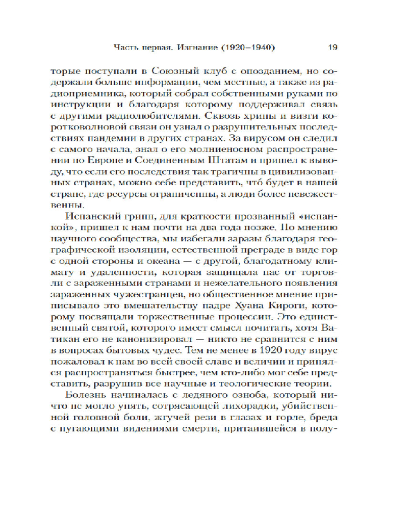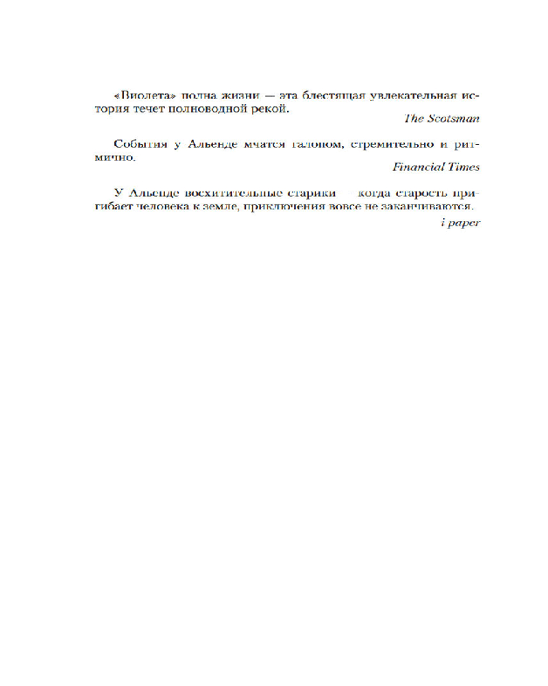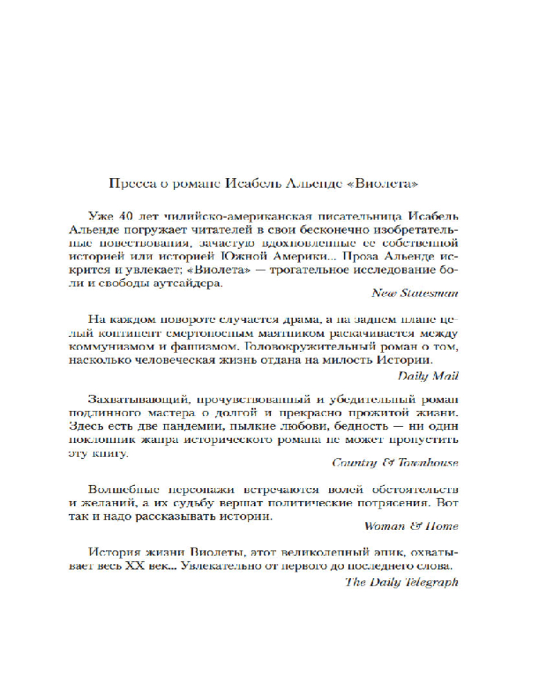 В начале этой истории — эпидемия испанского гриппа, в конце — эпидемия коронавируса, а между ними разворачивается долгая жизнь Виолеты, ее сто лет без одиночества. В этой жизни будут процветание и бедность, головокружительные любови и убийственные разочарования, страшные утраты и ошеломительные восторги, рождение нового, неотвратимость смерти, неизбежная мудрость. XX век — Великая депрессия, войны, взлеты и падения тиранов, борьба за права женщин — наложит отпечаток на судьбу Виолеты, родившейся однажды ночью во время бури и прожившей бурную жизнь до дна от первой до последней минуты, от пандемии до пандемии. Частная жизнь отдельного человека превращается у Альенде в грандиозную сагу, вселяет надежду, когда надежды истощаются, и вдохновляет, когда без вдохновения трудно двигаться дальше.