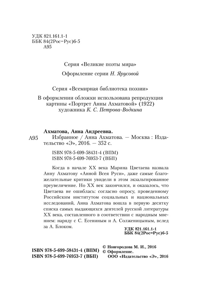 В данный момент этот товар отсутствует в продаже. Возможно, у нас найдется аналогичный или похожий товар здесь. Серия: Великие поэты мира Когда в начале ХХ века Марина Цветаева назвала Анну Ахматову «Анной Всея Руси», даже самые благожелательные критики увидели в этом экзальтированное преувеличение. Но ХХ век закончился, и оказалось, что Цветаева не ошиблась: согласно опросу, проведенному Российским институтом социальных и национальных исследований, Анна Ахматова вошла в первую десятку списка самых выдающихся деятелей русской литературы ХХ века, составленного в соответствии с народным мнением: наряду с. Есениным и А. Солженицыным, вслед за А. Блоком. |
