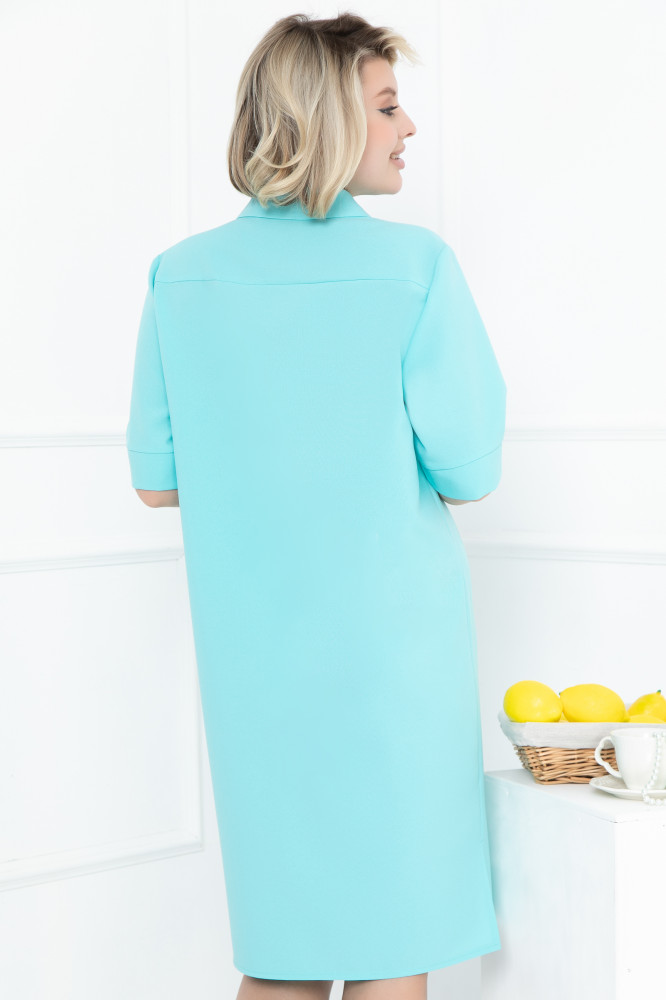 Настоящий тренд! Платье Вионе в мятном цвете — это модная доза витамина D! Платье-рубашка прямого силуэта из однотонной плательной ткани, которое подходит для любого вида фигуры. Рукав 3/4, оторочен манжетом.