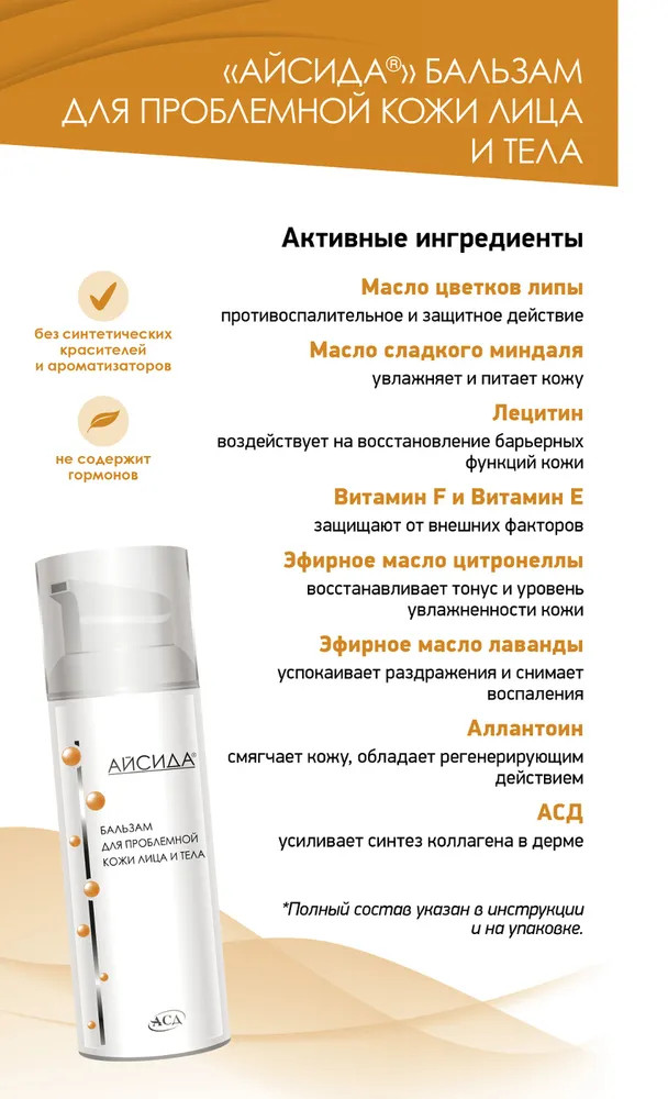 Айсида Бальзам для лица и телаВ данный момент этот товар отсутствует в продаже. Возможно, у нас найдется аналогичный или похожий товар здесь. Уход за сухой, повреждённой и раздражённой кожей. Восстановление защитного барьера кожи после агрессивного воздействия внешних факторов, применения косметических процедур. Сухость кожи после применения гормональной терапии. Бальзам для проблемной кожи быстро вернет вашей коже здоровый вид. Благодаря активным компонентам бальзам хорошо увлажняет, кожу, устраняет сухость и шелушение. Подходит для использования в любое время года, особенно для зимнего периода. |