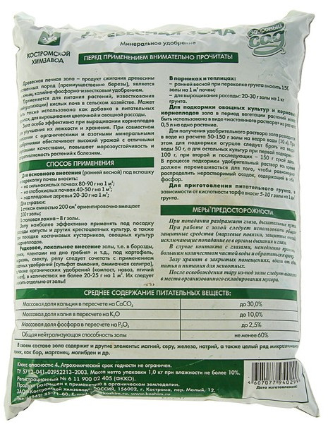 💳 Оплатить за товар можно при получении 🇰🇿 Есть бесплатная доставка по Казахстану от 1 дня 🎁 Копите бонусы с каждой покупки Древесная зола — бюджетный и доступный вариант удобрения, в котором содержится около 30 минералов, необходимых для правильного развития растений. Она нейтрализует кислотность почвы и делает огородные культуры непривлекательными для насекомых-вредителей. К тому же зола позитивно сказывается на воздухопроницаемости почвы — делает землю более рыхлой, что способствует развитию корневой системы растений. В состав золы входят такие полезные для растений элементы, как кальций, калий, натрий и магний. Без них наши зеленые питомцы не смогут полноценно развиваться и плодоносить. Так, карбонат кальция улучшает обменные процессы и ускоряет рост вегетативных тканей. Это вещество особенно важно для цветущих растений, так как способствует более пышному цветению. Силикат кальция «склеивает» клетки растения и помогает зеленому организму усваивать витамины. На дефицит этого соединения очень остро реагирует лук: луковицы у таких растений расслаиваются и усыхают. Сульфат кальция — это кальциевая соль серной кислоты, которая входит в состав такого популярного удобрения, как суперфосфат. |