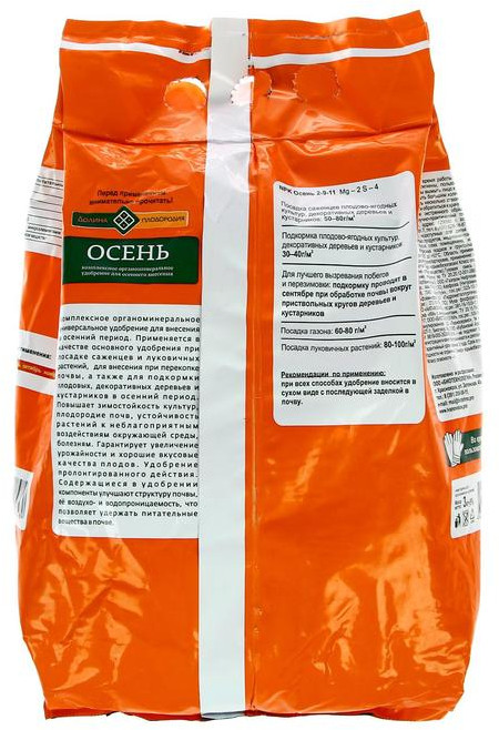 💳 Оплатить за товар можно при получении 🇰🇿 Есть бесплатная доставка по Казахстану от 1 дня 🎁 Копите бонусы с каждой покупки Комплексное органо-минеральное удобрение «Долина плодородия» предназначено для внесения в осенний период. Применяется в качестве основного удобрения при посадке саженцев и луковичных растений, для внесения при перекопки почвы в осенний период, а так же для подкормки плодовых, декоративно-лиственных деревьев и кустарников в осенний период. |