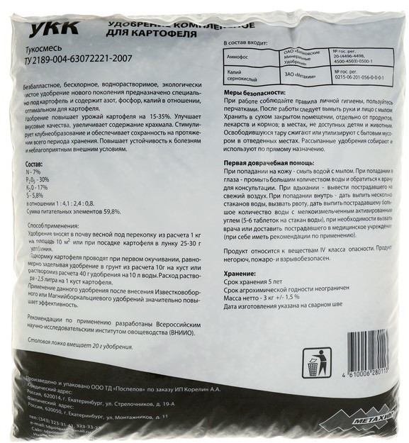 Способ применения: удобрение вносят в почву весной под перекопку из расчета 1 кг на площадь 10м2 или при посадке картофеля а лунку 25-30 г удобрения, подкормку картофеля проводят при первом окучивании, равномерно заделывая удобрение в грунт из расчета 10 г на куст или раствором из расчета 40 г удобрения на 10 л воды. Расход раствора — 2,5 литра на 1 куст картофеля.