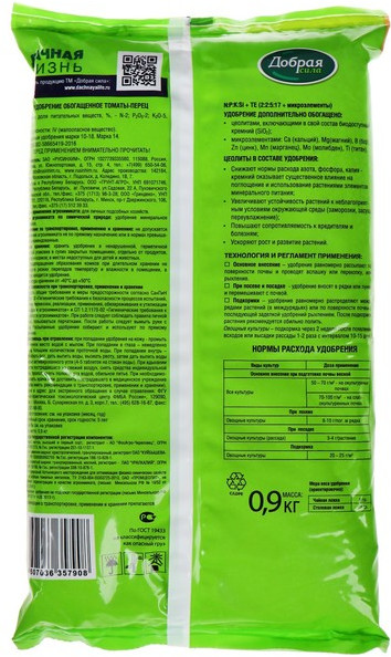 💳 Оплатить за товар можно при получении 🇰🇿 Есть бесплатная доставка по Казахстану от 1 дня 🎁 Копите бонусы с каждой покупки Ускоряет сроки созревания. Стимулирует образование крупных сильных завязей. Увеличивает сахаристость плодов. Повышает сопротивляемость к вредителям и болезням. Цеолиты в составе удобрения: снижают нормы расхода азота, фосфора, калия — кремний оказывает существенное влияние на поглощение и использование растениями элементов минерального питания, увеличивают устойчивость растений к неблагоприятным условиям окружающей среды (заморозки, засуха, переувлажнение), повышают сопротивляемость к вредителям и болезням, ускоряют рост и развитие растений. Основное внесение — удобрение равномерно рассыпают по поверхности почвы и проводят вспашку, или перекопку, или рыхление. При посеве и посадке — удобрение вносят в рядки или лунки и перемешивают с почвой. Подкормки — удобрение равномерно распределяют между рядами растений или по поверхности почвы с последующей заделкой удобрений рыхлением. После подкормок растения рекомендуется обильно полить. |