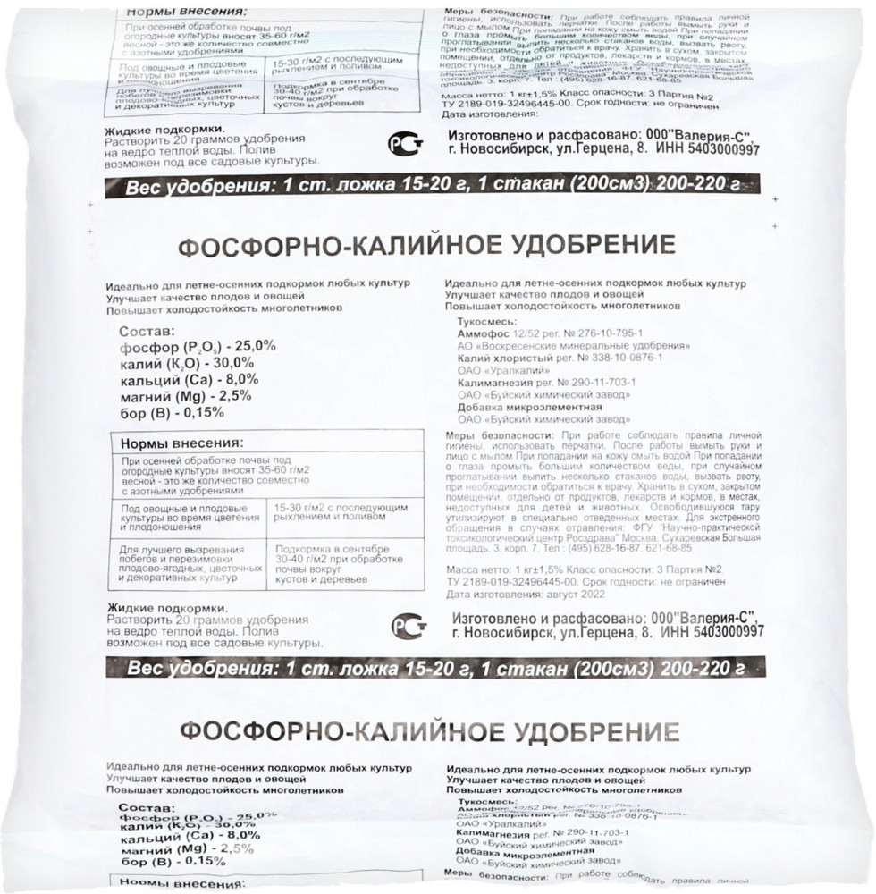Валерия-С Удобрение «Фосфорно-калийное»-40% +40 эффективность осеннее применение объём
