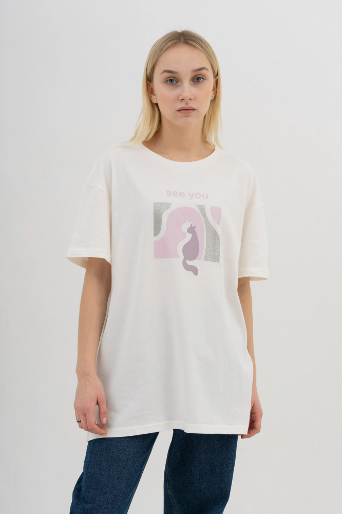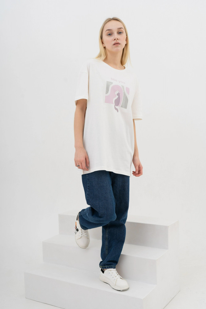 Футболка большемерка. Взяла 48/L..большевата, но не критично. Кто любит оверсайз...будет класс. Принт-наклейка, смотрится отлично. Материал -100% х/б. Качество хорошее.