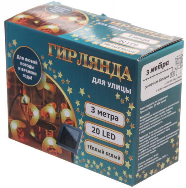 Гирлянда для улицы «Пчёлка»В данный момент этот товар отсутствует в продаже. Возможно, у нас найдется аналогичный или похожий товар здесь. Гирлянда идеально подойдет для декора интерьера дачи, деревьев, кустарников, беседки или террасы. Она не требует подключения к сети, работает от собственной солнечной батареи, заряжающейся днем от солнечного света. Заряда батареи хватает на 8-10 часов бесперебойной работы. Степень защиты IP-55 позволяет использовать ее в любую погоду. Пчёлки, как живые, будут сверкать и привлекать внимание окружающих. |