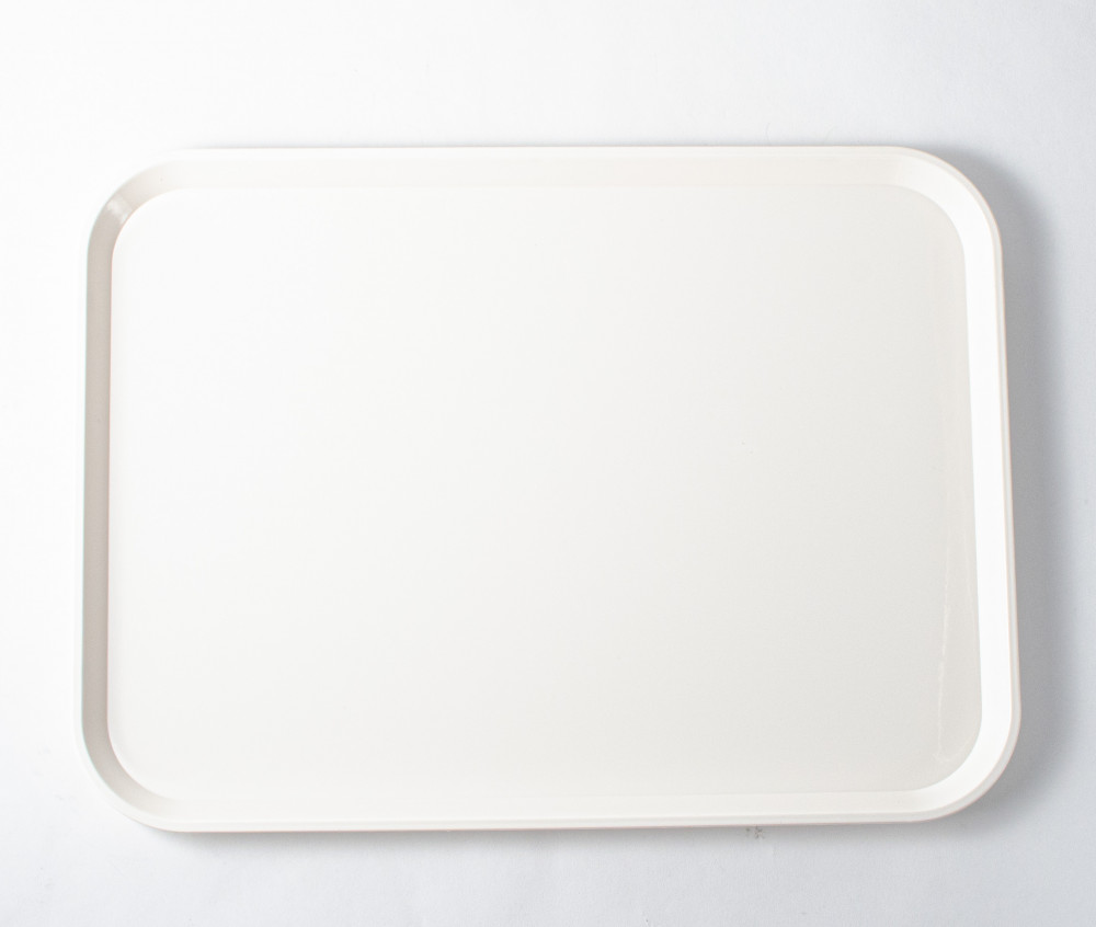 Поднос отличный. Очень крепкий, толстый пластик молочного цвета, без запаха. Размер дна 38х27 см.