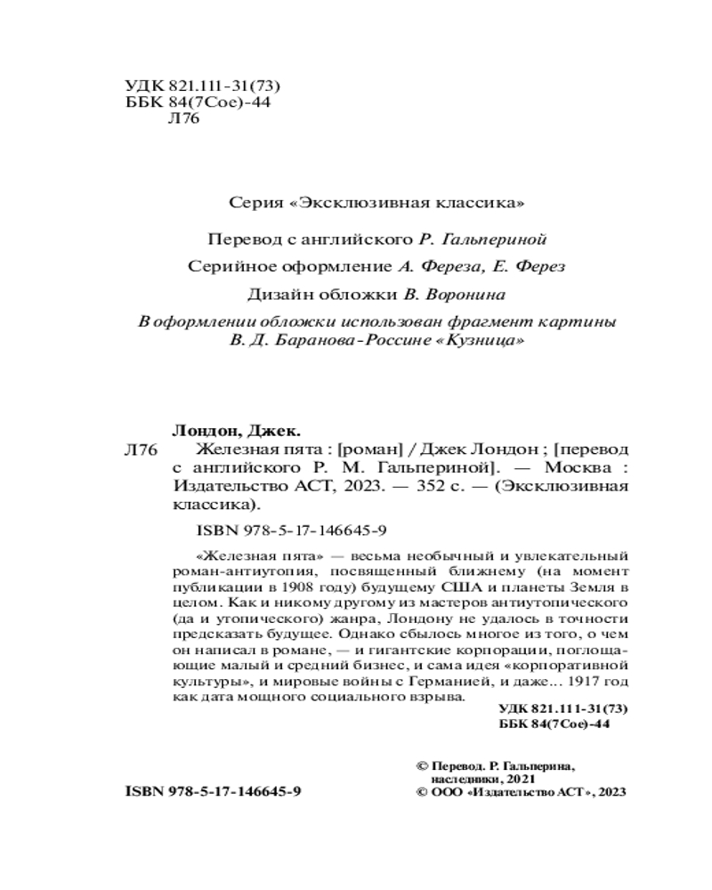 Железная пятаВ данный момент этот товар отсутствует в продаже. Возможно, у нас найдется аналогичный или похожий товар здесь. Серия: Эксклюзивная классика «Железная пята» — весьма необычный и увлекательный роман-антиутопия, посвященный ближнему (на момент публикации в 1908 году) будущему США и планеты Земля в целом. Как и никому другому из мастеров антиутопического (да и утопического) жанра, Лондону не удалось в точности предсказать будущее. Однако сбылось многое из того, о чем он написал в романе, — и гигантские корпорации, поглощающие малый и средний бизнес, и сама идея «корпоративной культуры», и мировые войны с Германией, и даже... 1917 год как дата мощного социального взрыва. |
