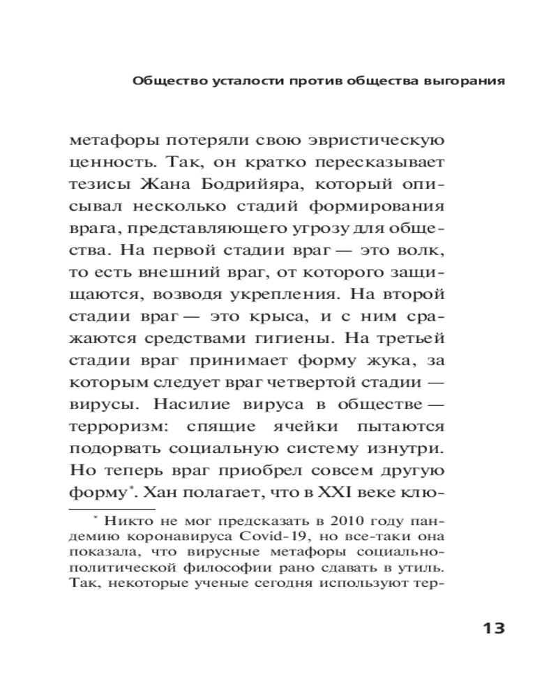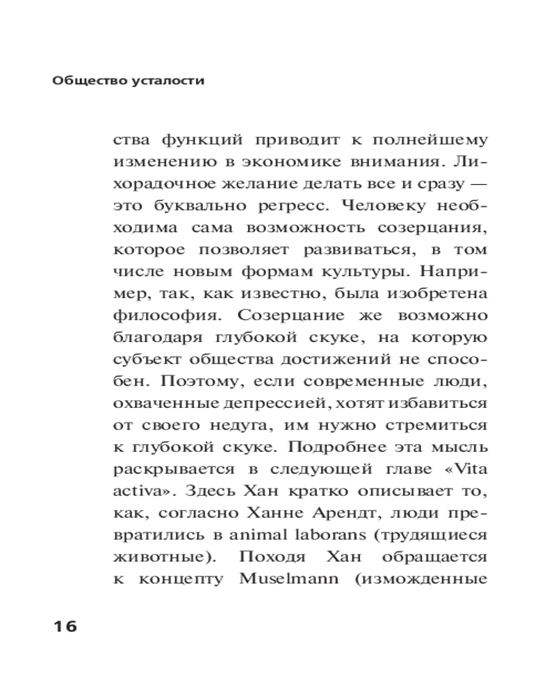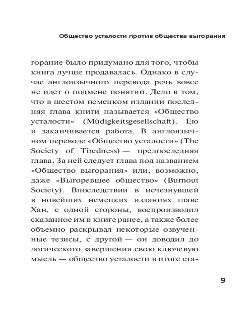 Так как это просто перевод научной статьи философа, она оч тяжело дается. Много заимствованных терминов, интернационализмом на уровне психологии и философии. Некоторые моменты читаешь по 2-3 раза, только потому что твой мозг физически тяжело воспринимает эту инфу. А так…прекрасные мысли. Солидарна с господином Ханом. Нынешнее положение человека в социуме настолько заставляет тебя преуспевать во всем, что ты даже не успеваешь изучить одно, как появляется другое и так вот и выходит…выгораешь. Понравилось его мышление, теперь посмотрим, что пишет в «Агонии Эроса»