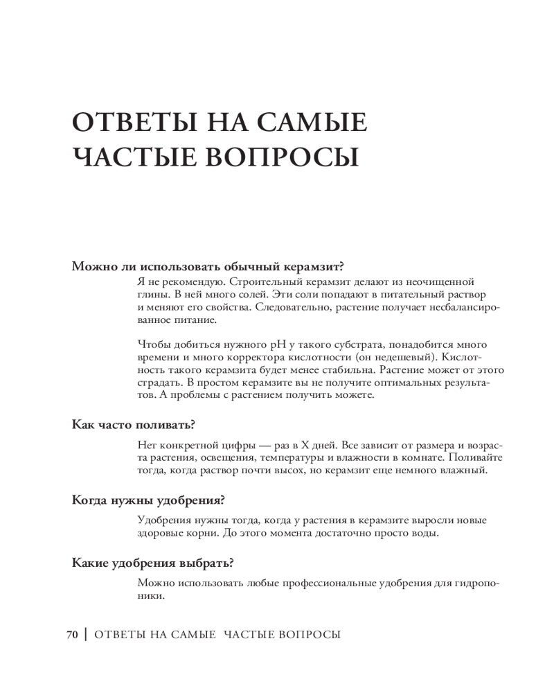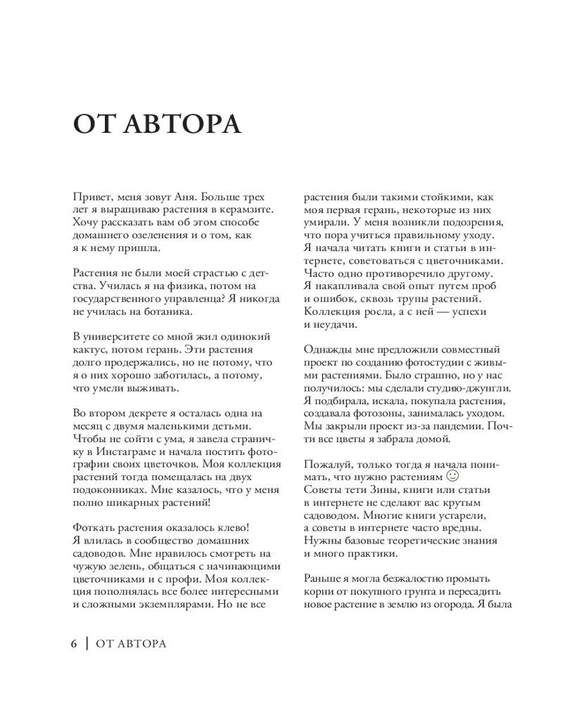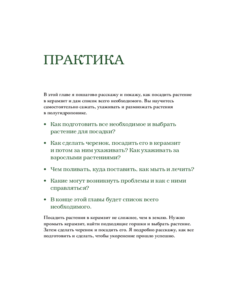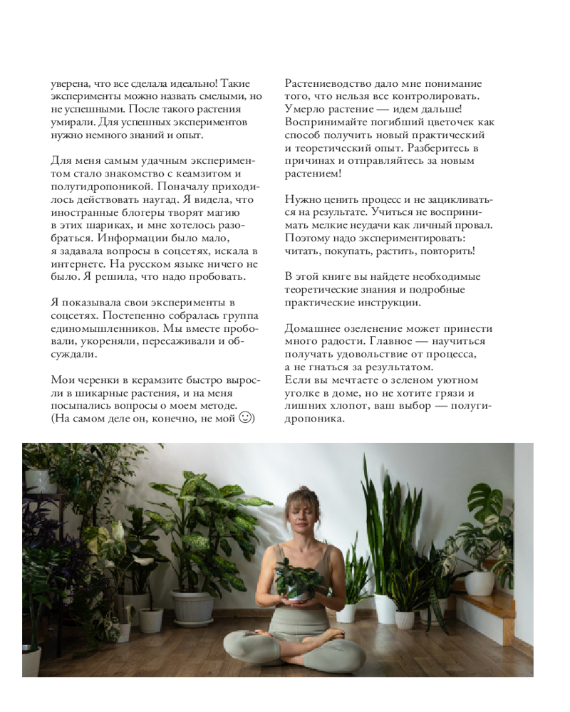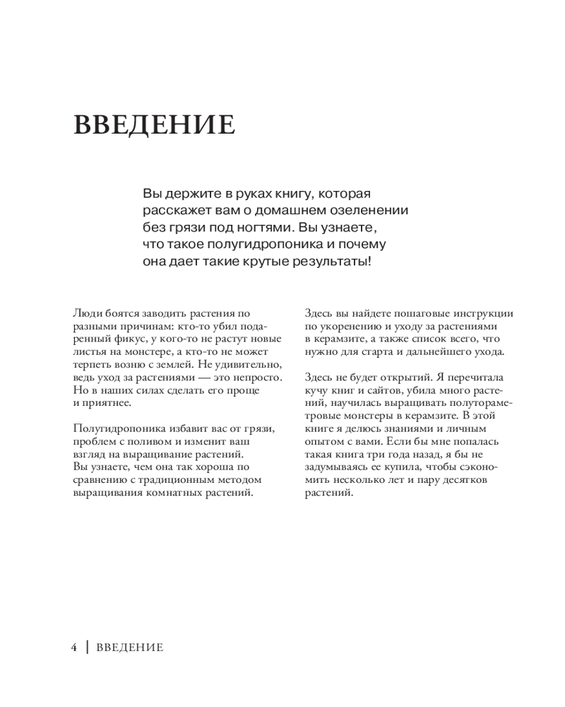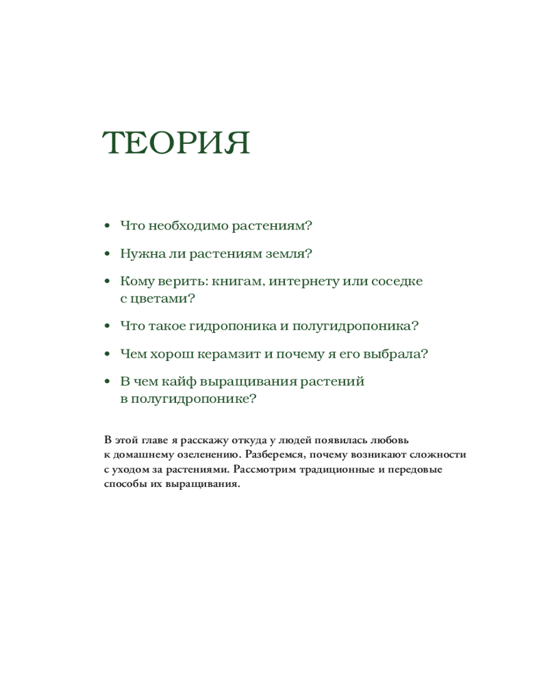 Вы держите в руках уникальную книгу, которая расскажет о домашнем озеленении без грязи под ногтями. Вы узнаете, что такое полугидропоника и чем она хороша в сравнении с традиционными методами содержания растений. С этой книгой вы озелените свою квартиру, не запачкав руки, и поймете, почему необходимость почвы — это всего лишь беспочвенный миф! Здесь вы найдете пошаговые инструкции по укоренению и дальнейшему уходу за растениями в керамзите, а также список всего необходимого для старта.