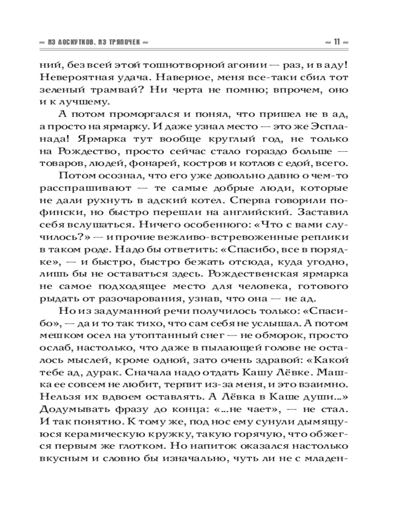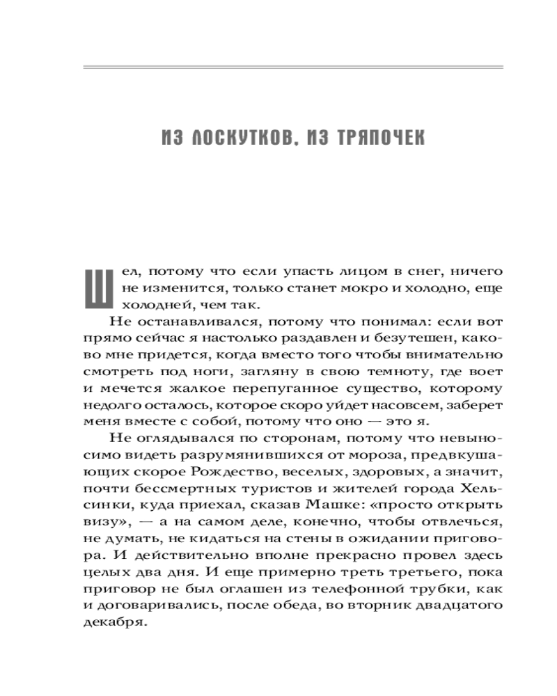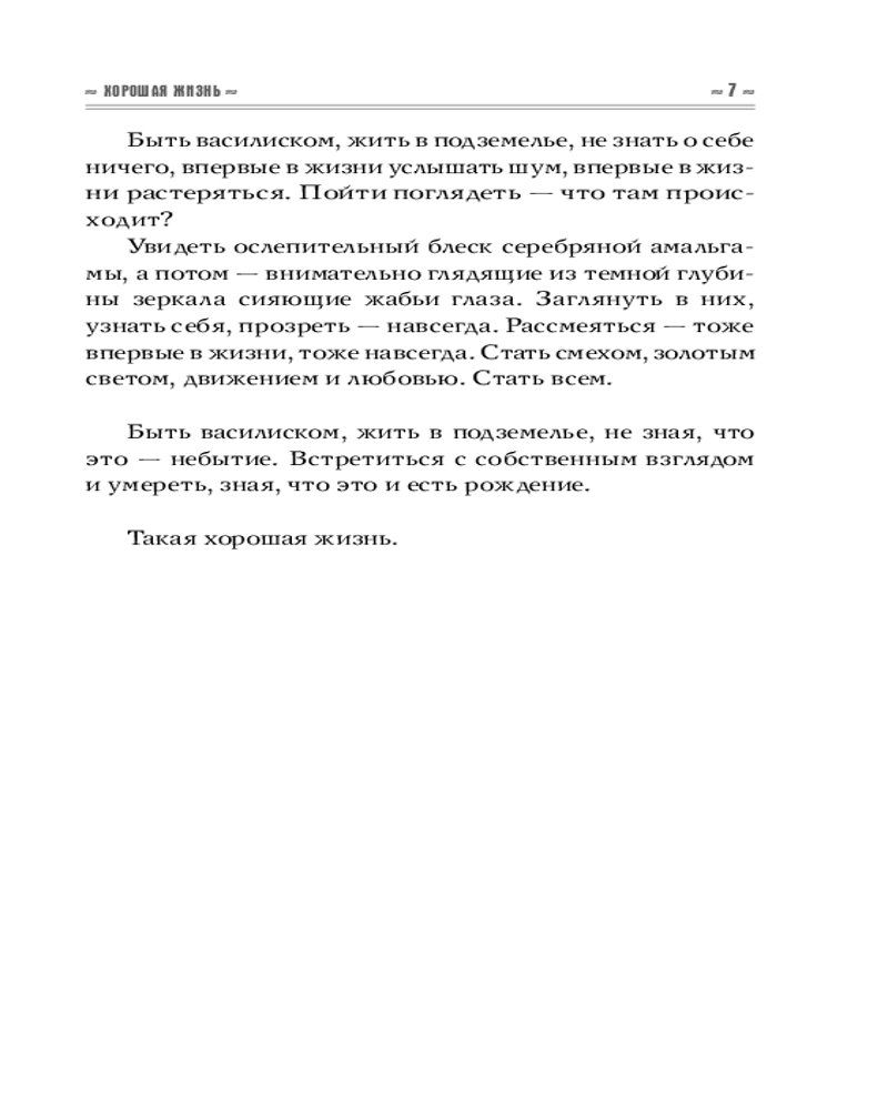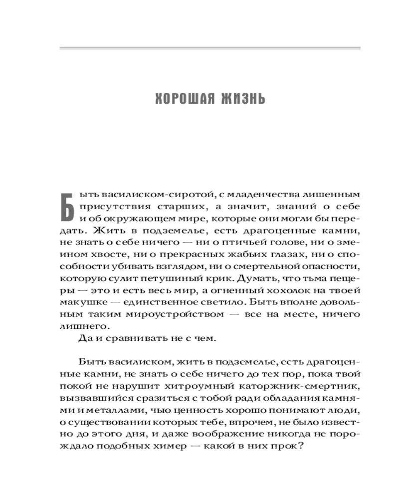 «Быть василиском-сиротой, с младенчества лишенным присутствия старших, а значит, знаний о себе и об окружающем мире, которые они могли бы передать. Жить в подземелье, есть драгоценные камни, не знать о себе ничего — ни о птичьей голове, ни о змеином хвосте, ни о прекрасных жабьих глазах, ни о способности убивать взглядом, ни о смертельной опасности, которую сулит петушиный крик. Думать, что тьма пещеры — это и есть весь мир, а огненный хохолок на твоей макушке — единственное светило. Быть вполне довольным таким мироустройством — все на месте, ничего лишнего, да и сравнивать не с чем...» |