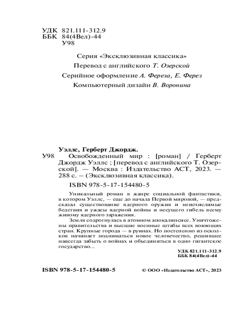 Освобожденный мирВ данный момент этот товар отсутствует в продаже. Возможно, у нас найдется аналогичный или похожий товар здесь. Серия: Эксклюзивная классика Герберт Уэллс — «Освобожденный мир» |
