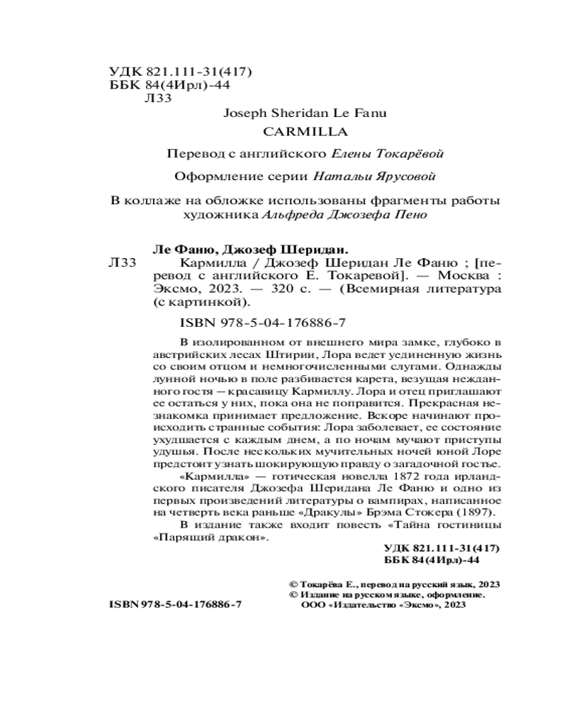 КармиллаВ данный момент этот товар отсутствует в продаже. Возможно, у нас найдется аналогичный или похожий товар здесь. Серия: Всемирная литература (новое оформление) В изолированном от внешнего мира замке, глубоко в австрийских лесах Штирии, Лора ведет уединенную жизнь со своим отцом и немногочисленными слугами. Однажды лунной ночью в поле разбивается карета, везущая нежданного гостя — красавицу Кармиллу. Лора и отец приглашают ее остаться у них, пока она не поправится. Прекрасная незнакомка принимает предложение. Вскоре начинают происходить странные события: Лора заболевает, ее состояние ухудшается с каждым днем, а по ночам мучают приступы удушья. После нескольких мучительных ночей юной Лоре предстоит узнать шокирующую правду о загадочной гостье. |