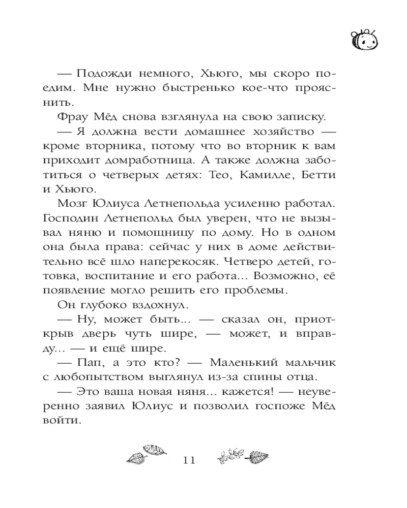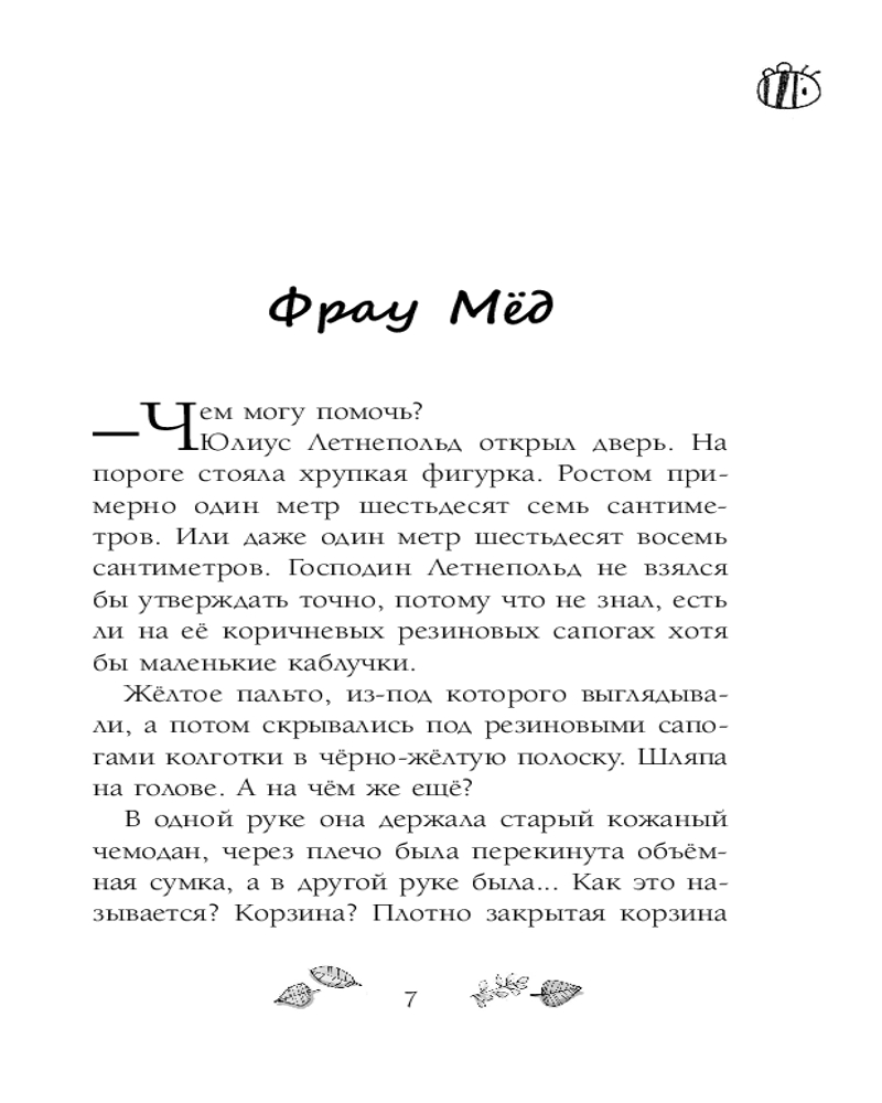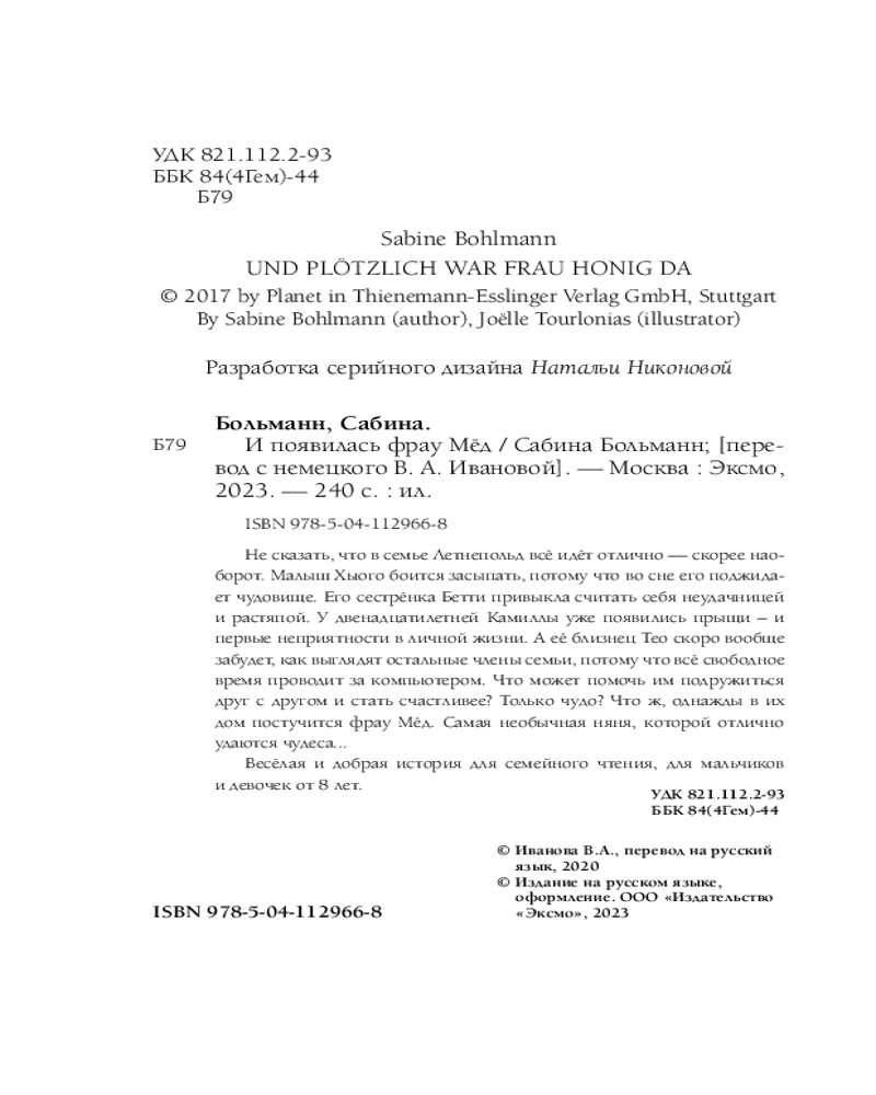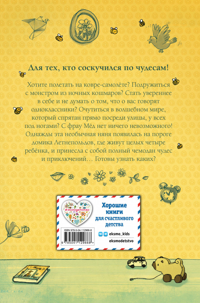 В данный момент этот товар отсутствует в продаже. Возможно, у нас найдется аналогичный или похожий товар здесь. Серия: Детск. Фрау Мёд. Самая НЕобычная няня Книга для тех, кто не боится чудес! Хотите полетать на ковре-самолёте? Подружиться с монстром из ночных кошмаров? Стать увереннее в себе и не думать о том, что о вас говорят одноклассники? Очутиться в волшебном мире, который спрятан прямо посреди улицы, у всех под ногами? С фрау Мёд нет ничего невозможного! Однажды эта необычная няня появилась на пороге домика Летнепольдов, где живёт целых четыре ребёнка, и принесла с собой полный чемодан чудес и приключений... Готовы узнать, каких?